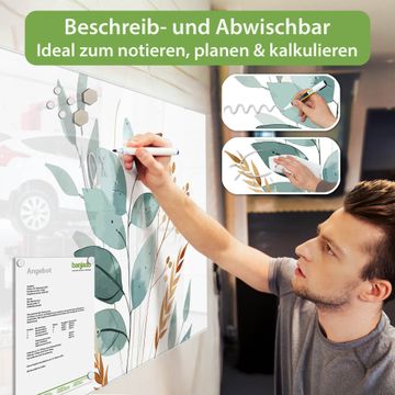 Die banjado Glas Magnettafel mit dem Motiv Motiv Minimalistische Blätter verbindet Funktionalität mit Stil. Sie ersetzt das Zettelchaos durch klare Strukturen und bringt dabei eine warme, natürliche Atmosphäre in Ihr Zuhause. Ob im Büro, in der Küche oder im Eingangsbereich - dieses Design-Board zieht Blicke an und sorgt für Ordnung mit Charakter.