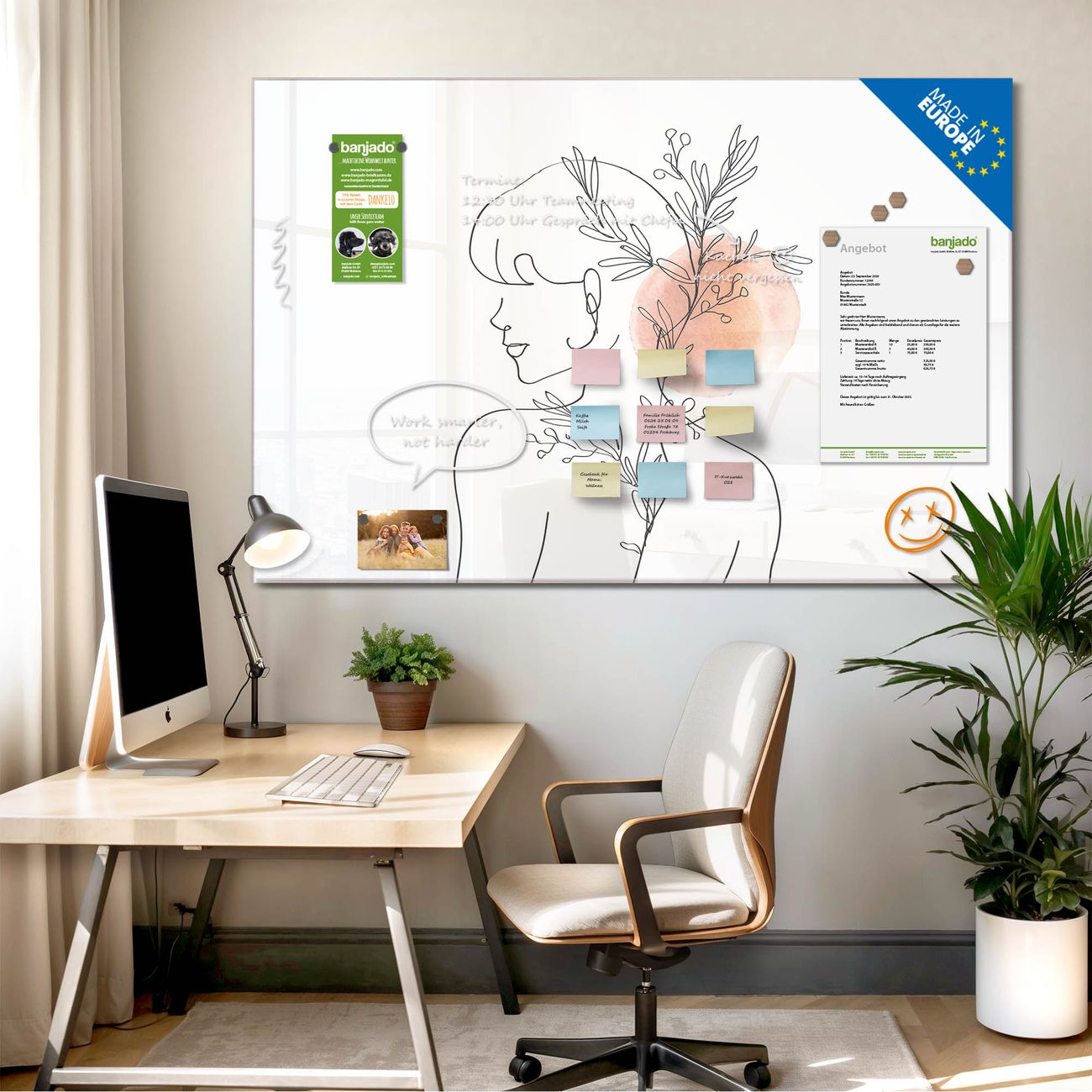 Jede Glas Magnettafel wird in unserer Werkstatt von Hand gefertigt und sorgfältig geprüft. So erhalten Sie ein echtes Qualitätsprodukt, das Funktion und Ästhetik perfekt vereint.?? Warum banjado?