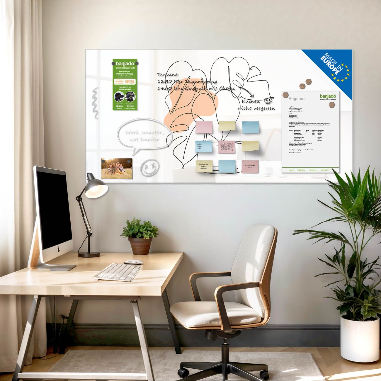 Jede Glas Magnettafel wird in unserer Werkstatt von Hand gefertigt und sorgfältig geprüft. So erhalten Sie ein echtes Qualitätsprodukt, das Funktion und Ästhetik perfekt vereint.?? Warum banjado?