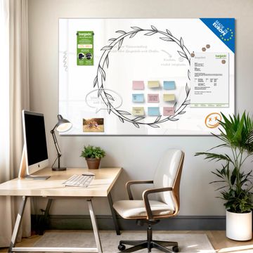 Material: 4mm Sicherheitsglas mit Metallrückwand Eigenschaften: beschreibbar, magnetisch, kratzfest Maße: 120x80x0,6cm, 14,40kg schwer Motiv Nummer 13538 Minimalistischer Blätterkranz Zubehör: inklusive 4 Neodym-Magnete