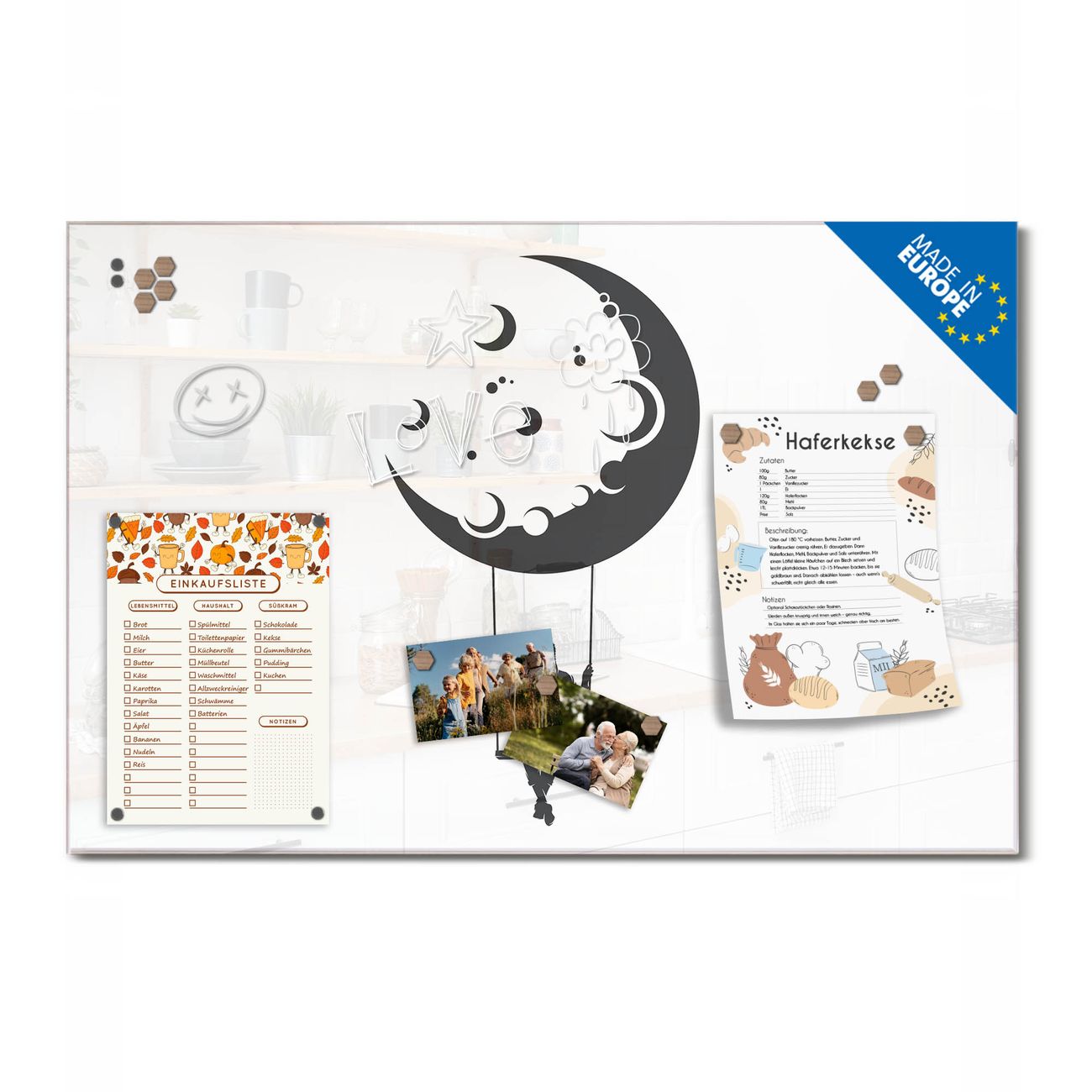 Material: 4mm Sicherheitsglas mit Metallrückwand Eigenschaften: beschreibbar, magnetisch, kratzfest Maße: 75x50x0,6cm, 5,63kg schwer Motiv Nummer 13350 Mondschaukel Zubehör: inklusive 4 Neodym-Magnete