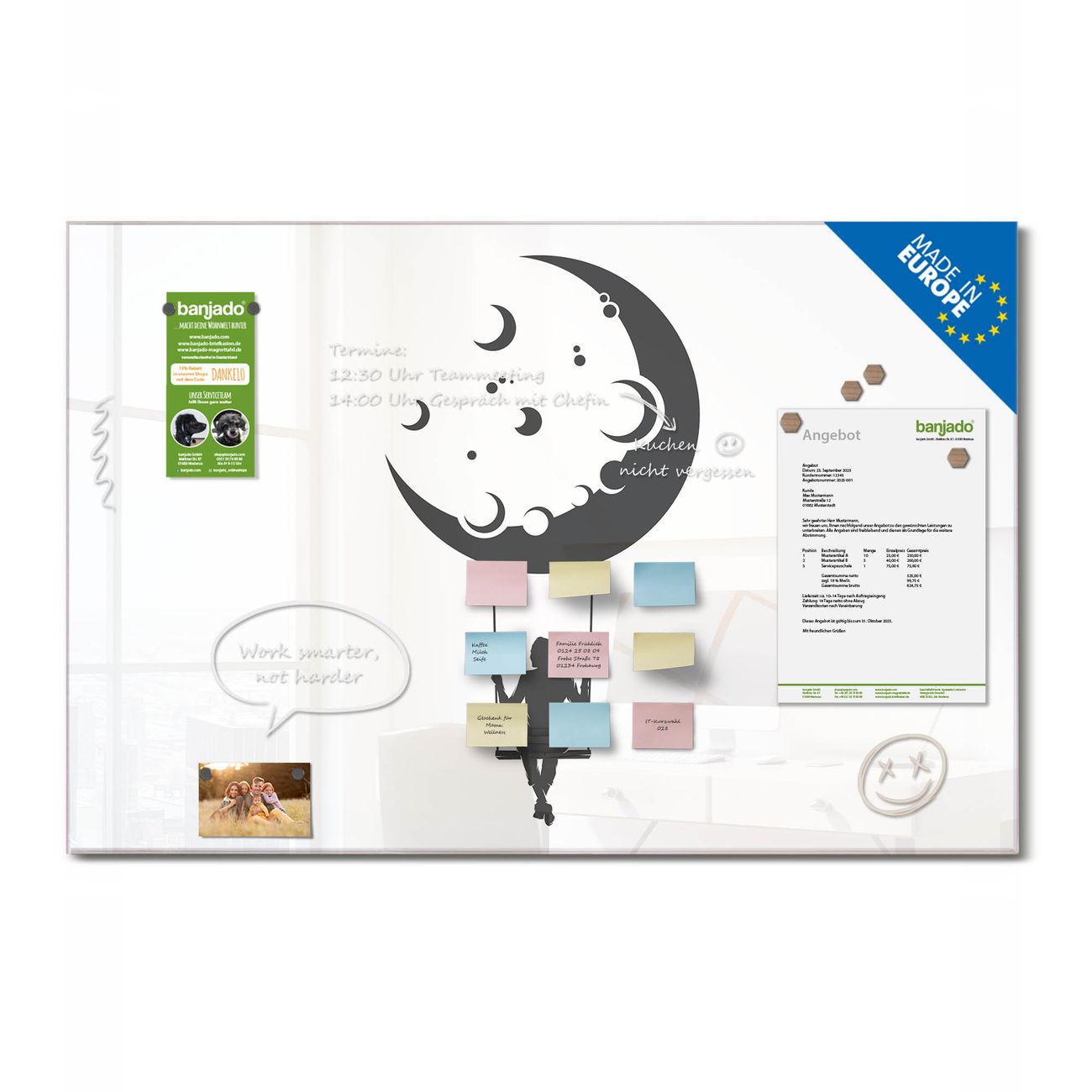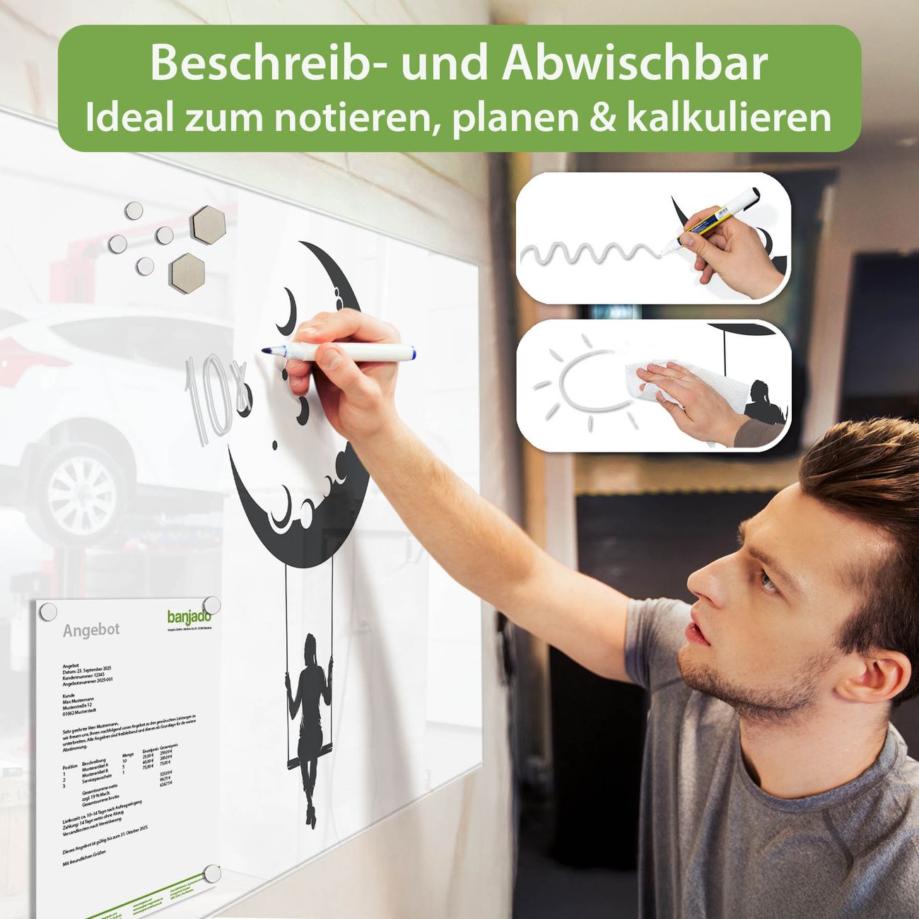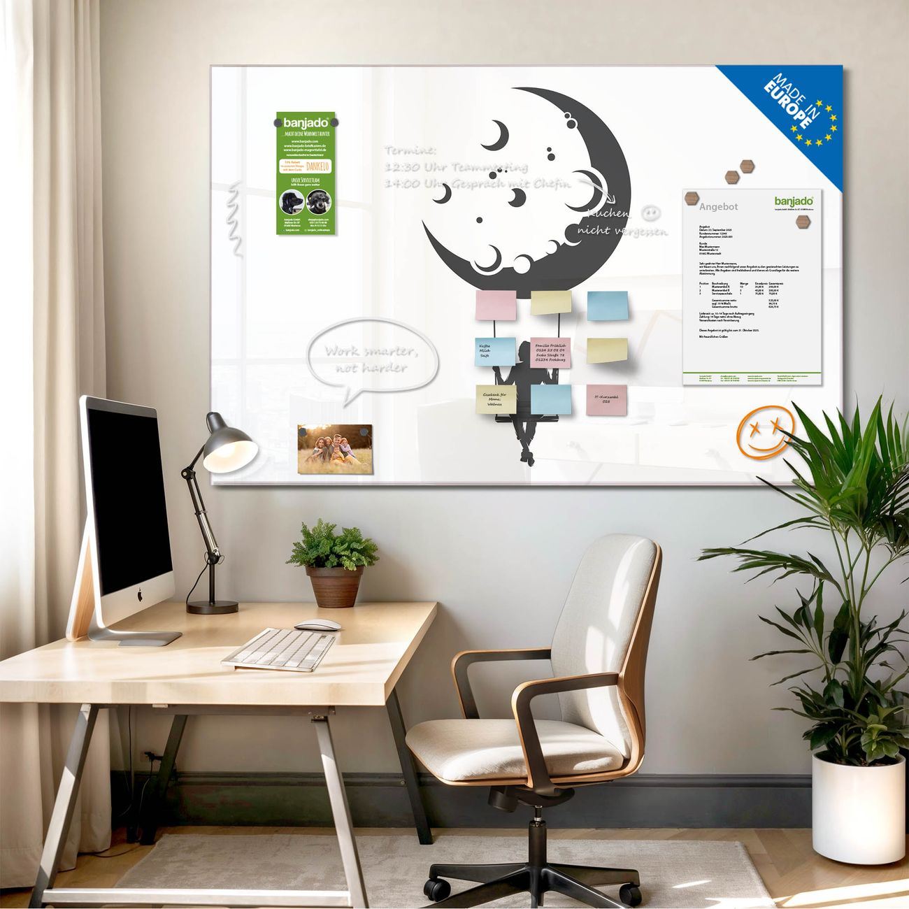 Jede Glas Magnettafel wird in unserer Werkstatt von Hand gefertigt und sorgfältig geprüft. So erhalten Sie ein echtes Qualitätsprodukt, das Funktion und Ästhetik perfekt vereint.?? Warum banjado?