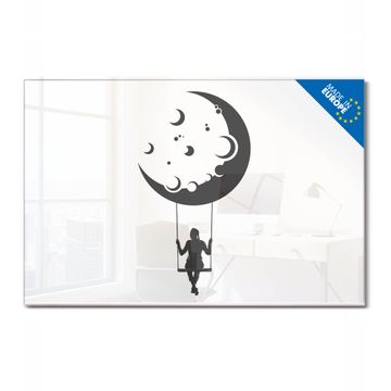 Material: 4mm Sicherheitsglas mit Metallrückwand Eigenschaften: beschreibbar, magnetisch, kratzfest Maße: 120x80x0,6cm, 14,40kg schwer Motiv Nummer 13350 Mondschaukel Zubehör: inklusive 4 Neodym-Magnete