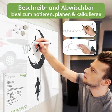 Auf der glatten Glasoberfläche lassen sich Termine, Rezepte oder Notizen ganz einfach mit Kreidestiften festhalten und rückstandslos entfernen. Starke Neodym-Magnete halten Ihre wichtigsten Erinnerungen sicher an Ort und Stelle. So entsteht Ihre ganz persönliche Ideenwand - jeden Tag neu.