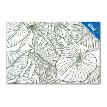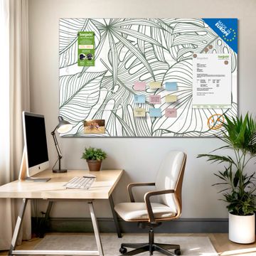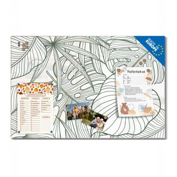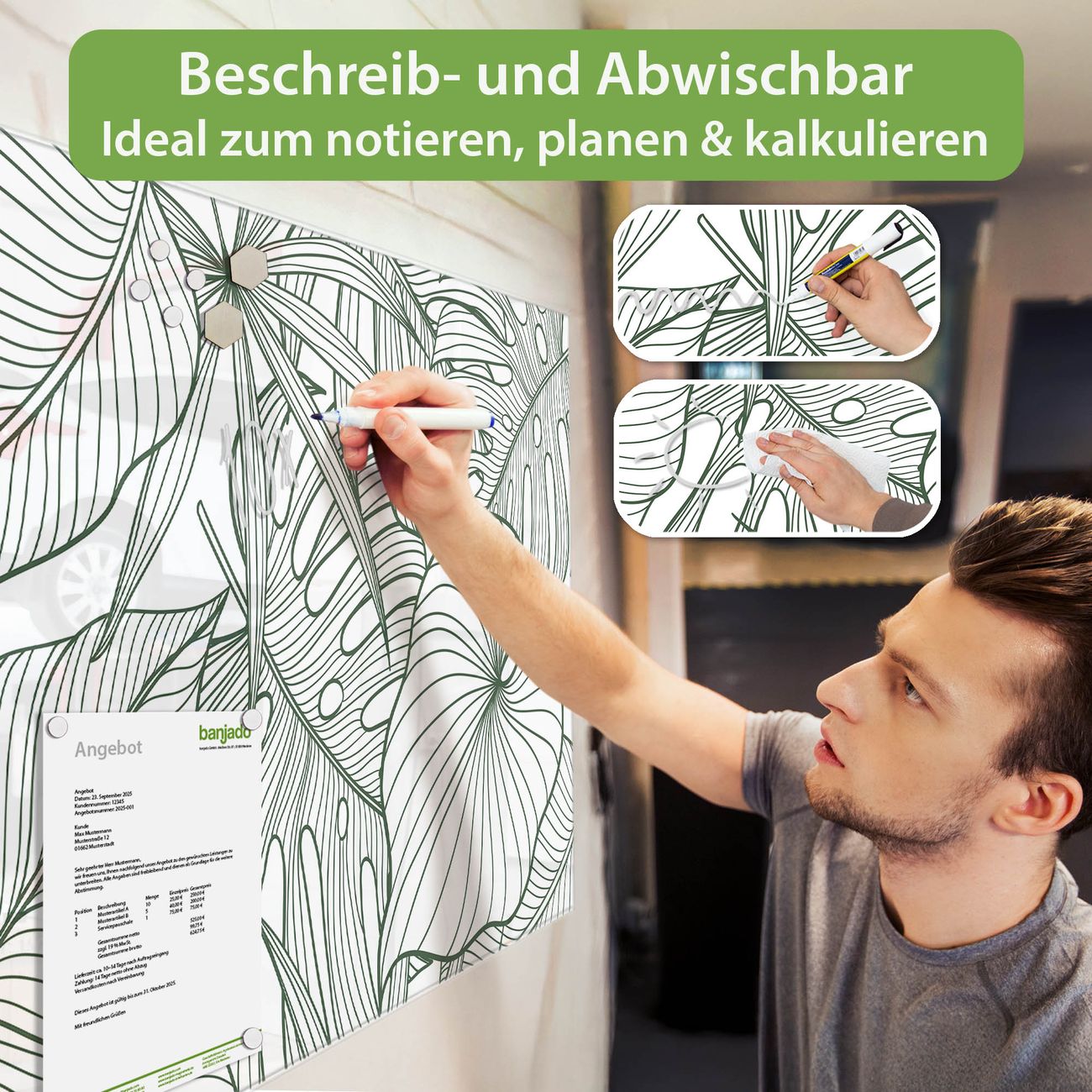 Material: 4mm Sicherheitsglas mit Metallrückwand Eigenschaften: beschreibbar, magnetisch, kratzfest Maße: 60x40x0,6cm, 3,6kg schwer Motiv Nummer 13051 Monstera 2 Zubehör: inklusive 4 Neodym-Magnete