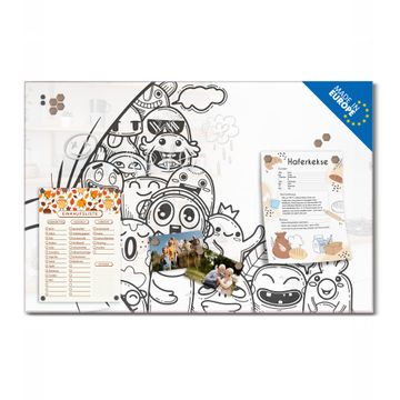 Material: 4mm Sicherheitsglas mit Metallrückwand Eigenschaften: beschreibbar, magnetisch, kratzfest Maße: 75x50x0,6cm, 5,63kg schwer Motiv Nummer 13471 Monsterparty Zubehör: inklusive 4 Neodym-Magnete