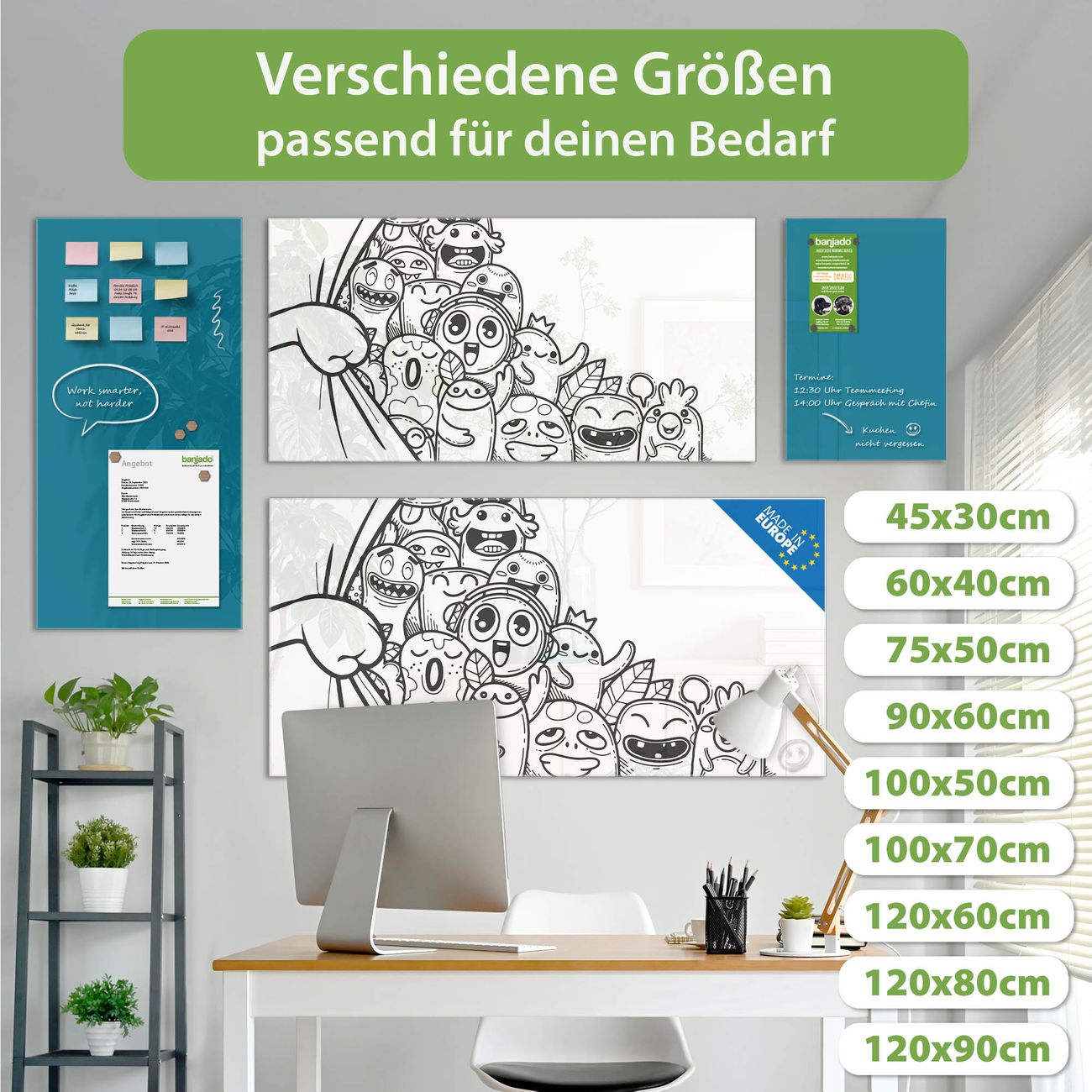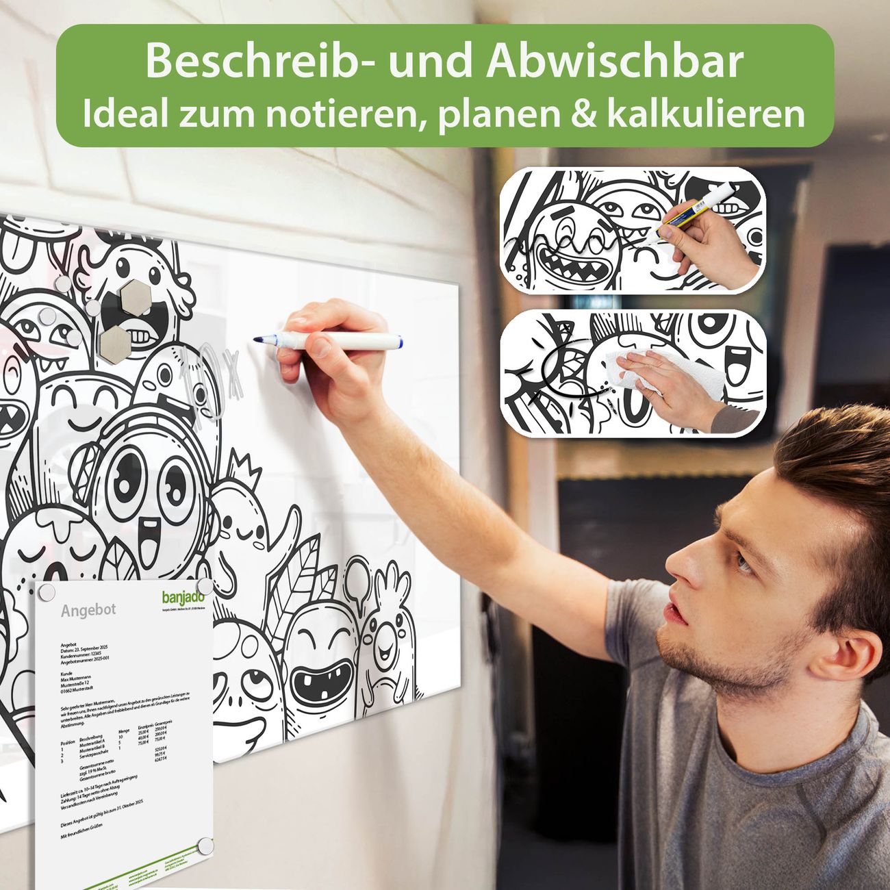 Jede Glas Magnettafel wird in unserer Werkstatt von Hand gefertigt und sorgfältig geprüft. So erhalten Sie ein echtes Qualitätsprodukt, das Funktion und Ästhetik perfekt vereint.?? Warum banjado?