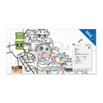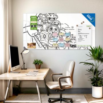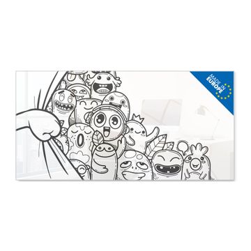 Material: 4mm Sicherheitsglas mit Metallrückwand Eigenschaften: beschreibbar, magnetisch, kratzfest Maße: 100x50x0,6cm, 7,50kg schwer Motiv Nummer 13471 Monsterparty Zubehör: inklusive 4 Neodym-Magnete