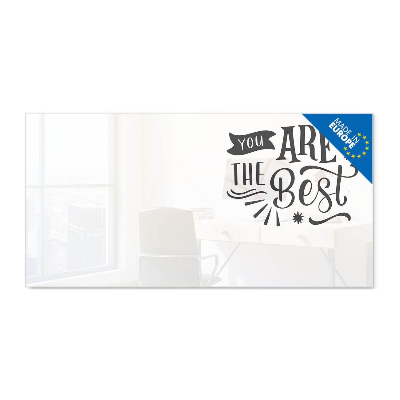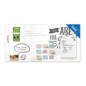Material: 4mm Sicherheitsglas mit Metallrückwand Eigenschaften: beschreibbar, magnetisch, kratzfest Maße: 100x50x0,6cm, 7,50kg schwer Motiv Nummer 13367 Motivationsspruch Zubehör: inklusive 4 Neodym-Magnete