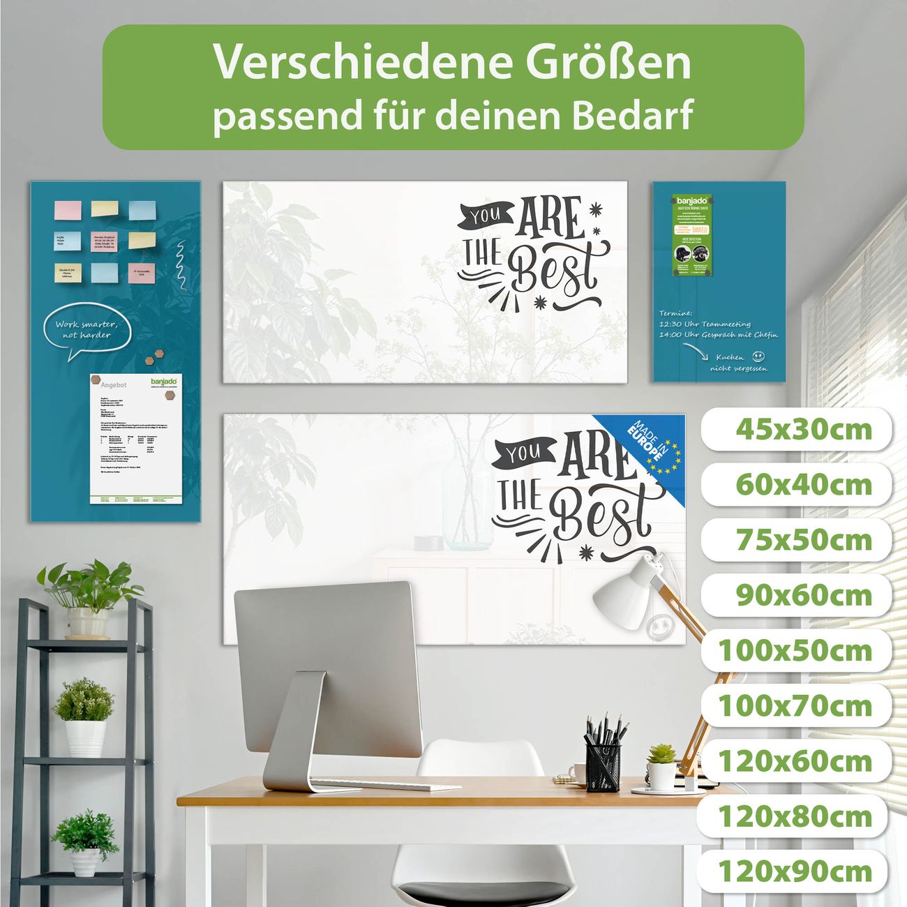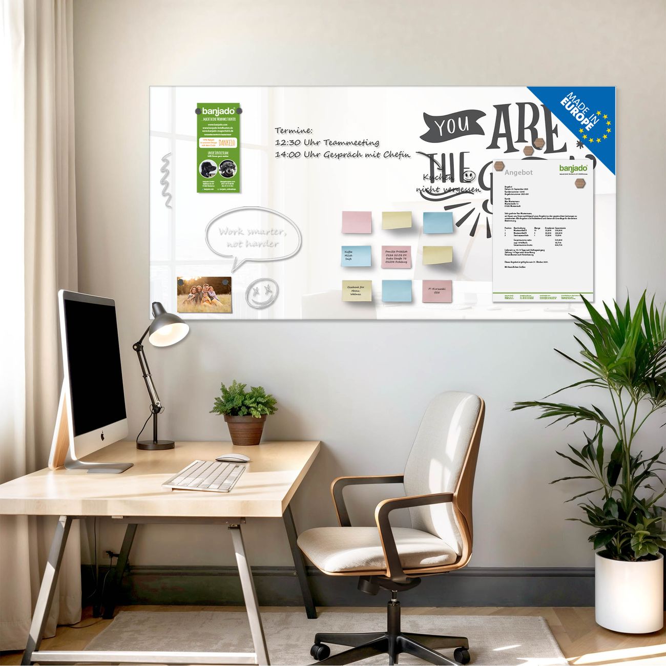 Jede Glas Magnettafel wird in unserer Werkstatt von Hand gefertigt und sorgfältig geprüft. So erhalten Sie ein echtes Qualitätsprodukt, das Funktion und Ästhetik perfekt vereint.?? Warum banjado?