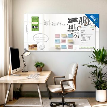Auf der glatten Glasoberfläche lassen sich Termine, Rezepte oder Notizen ganz einfach mit Kreidestiften festhalten und rückstandslos entfernen. Starke Neodym-Magnete halten Ihre wichtigsten Erinnerungen sicher an Ort und Stelle. So entsteht Ihre ganz persönliche Ideenwand - jeden Tag neu.