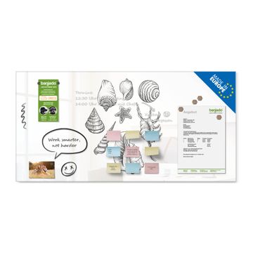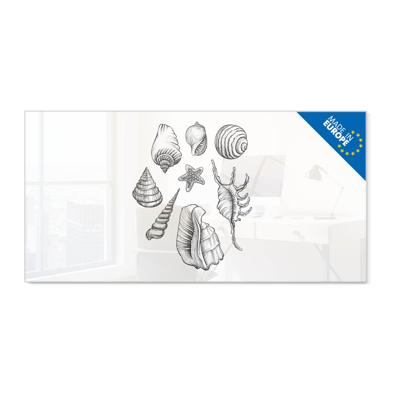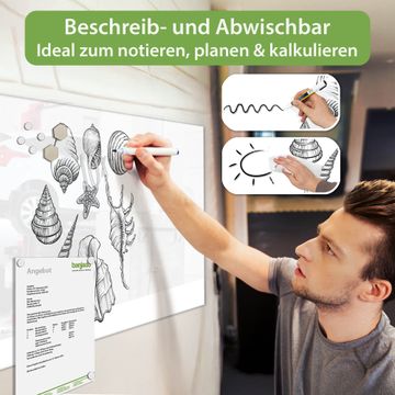 Material: 4mm Sicherheitsglas mit Metallrückwand Eigenschaften: beschreibbar, magnetisch, kratzfest Maße: 100x50x0,6cm, 7,50kg schwer Motiv Nummer 13075 Muschel 10 Zubehör: inklusive 4 Neodym-Magnete