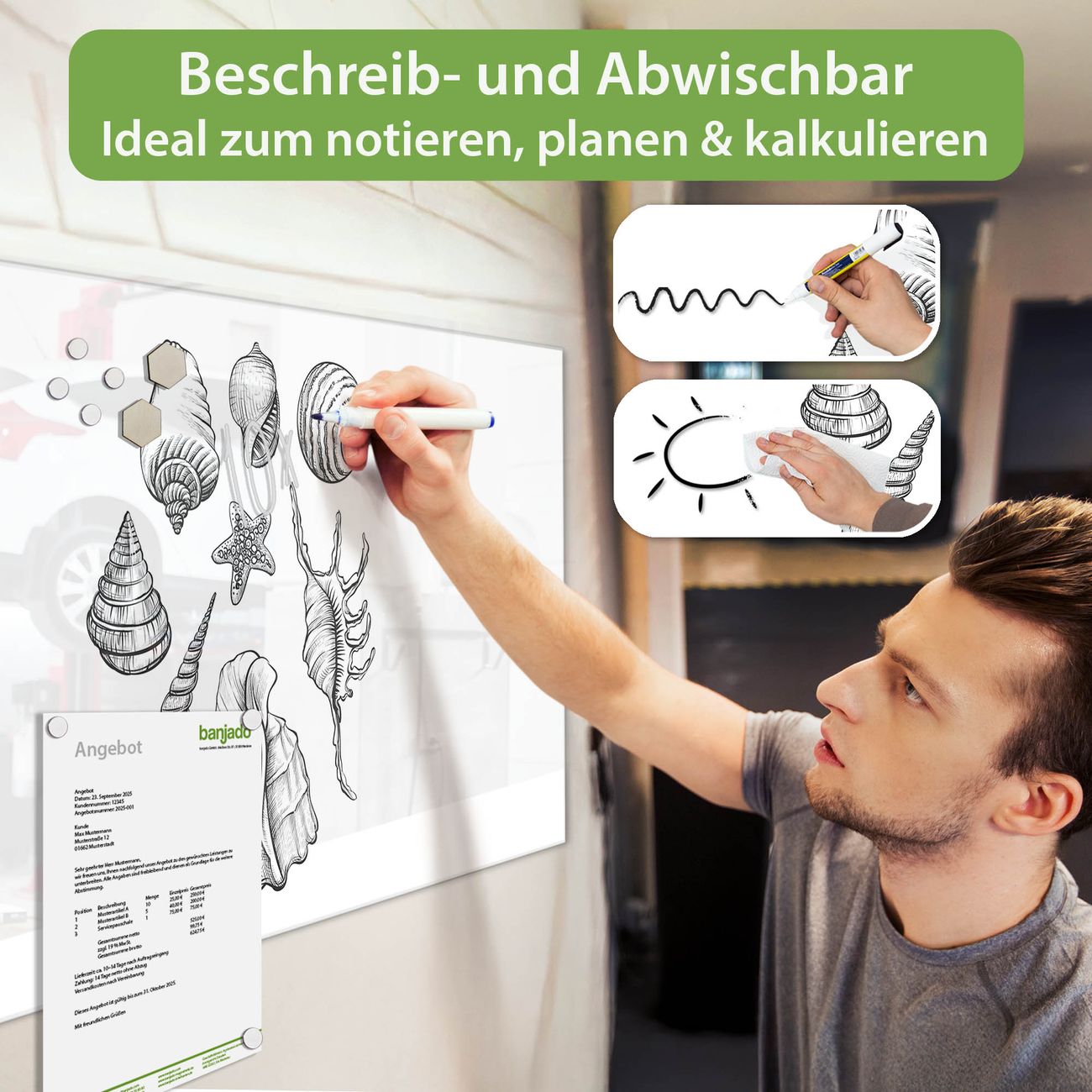 Jede Glas Magnettafel wird in unserer Werkstatt von Hand gefertigt und sorgfältig geprüft. So erhalten Sie ein echtes Qualitätsprodukt, das Funktion und Ästhetik perfekt vereint.?? Warum banjado?