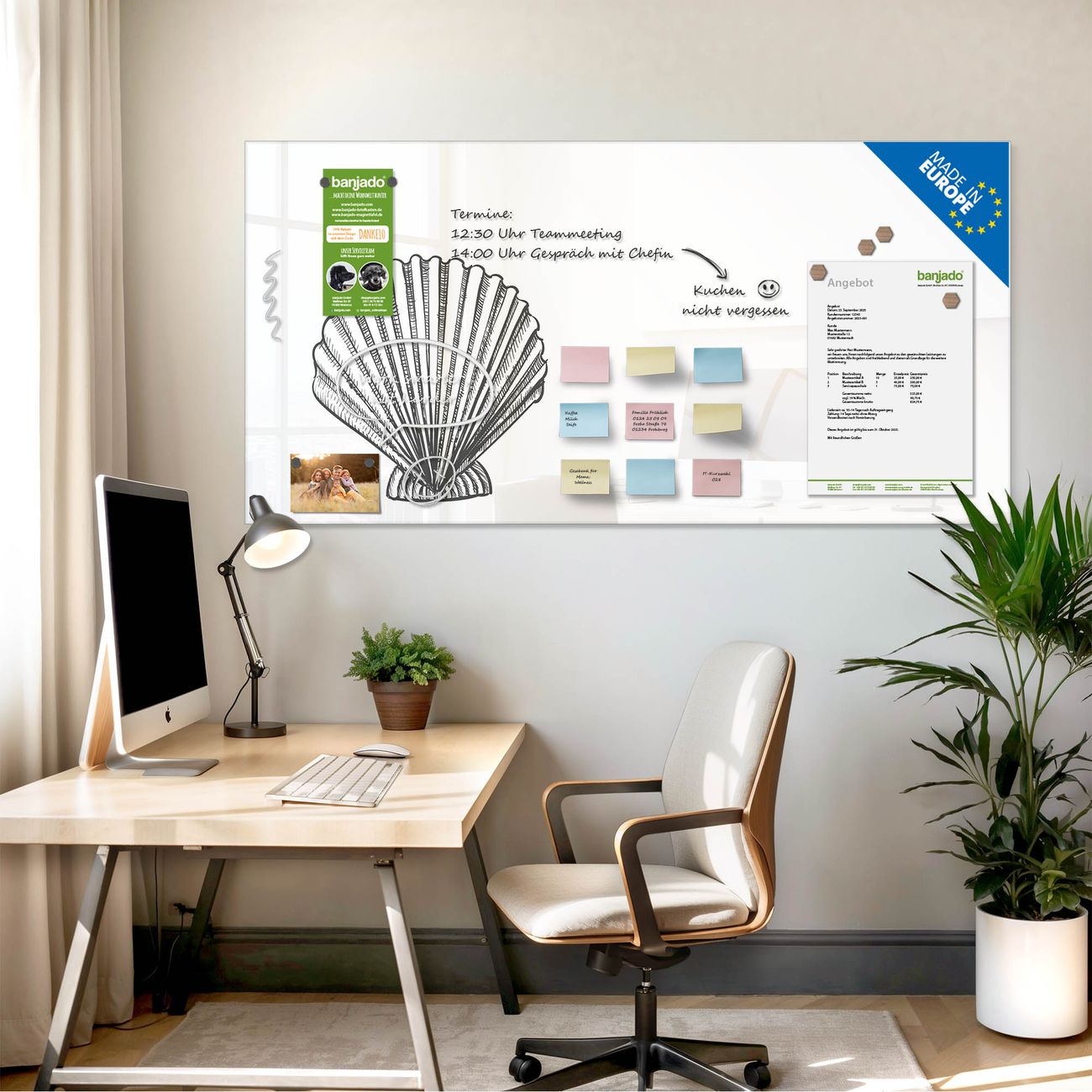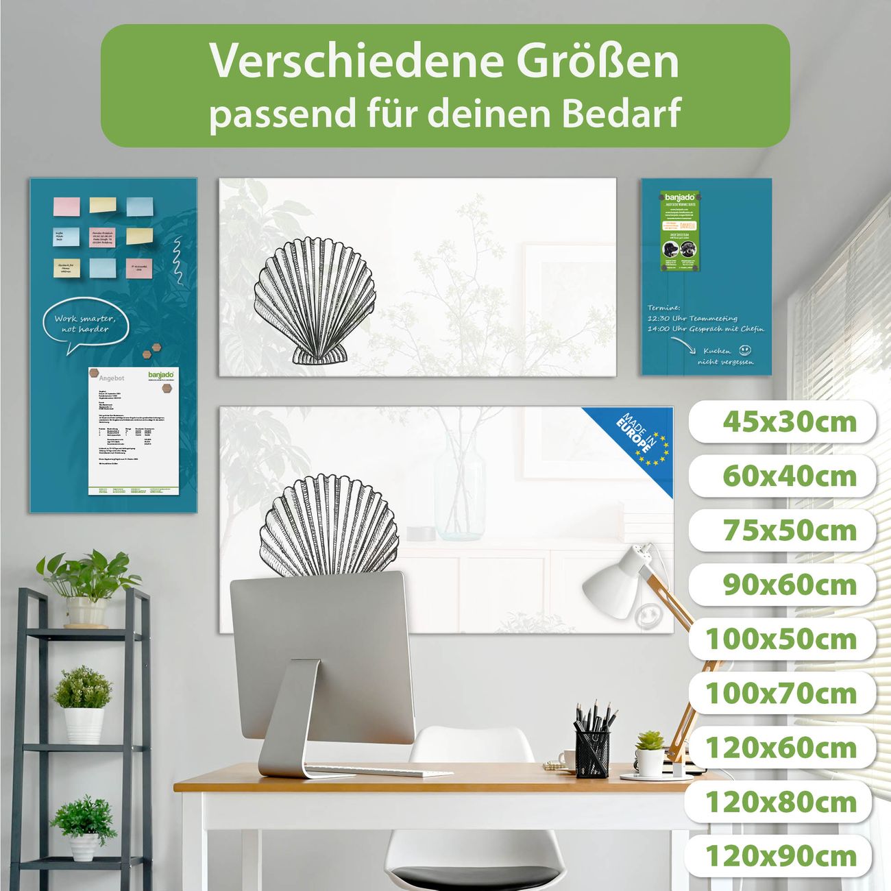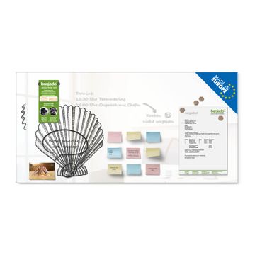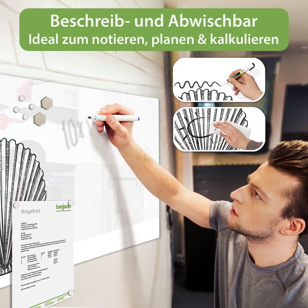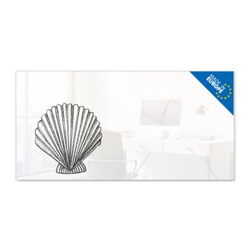Material: 4mm Sicherheitsglas mit Metallrückwand Eigenschaften: beschreibbar, magnetisch, kratzfest Maße: 100x50x0,6cm, 7,50kg schwer Motiv Nummer 13071 Muschel 6 Zubehör: inklusive 4 Neodym-Magnete