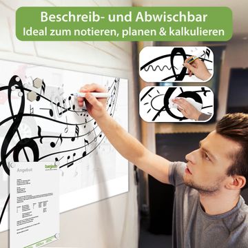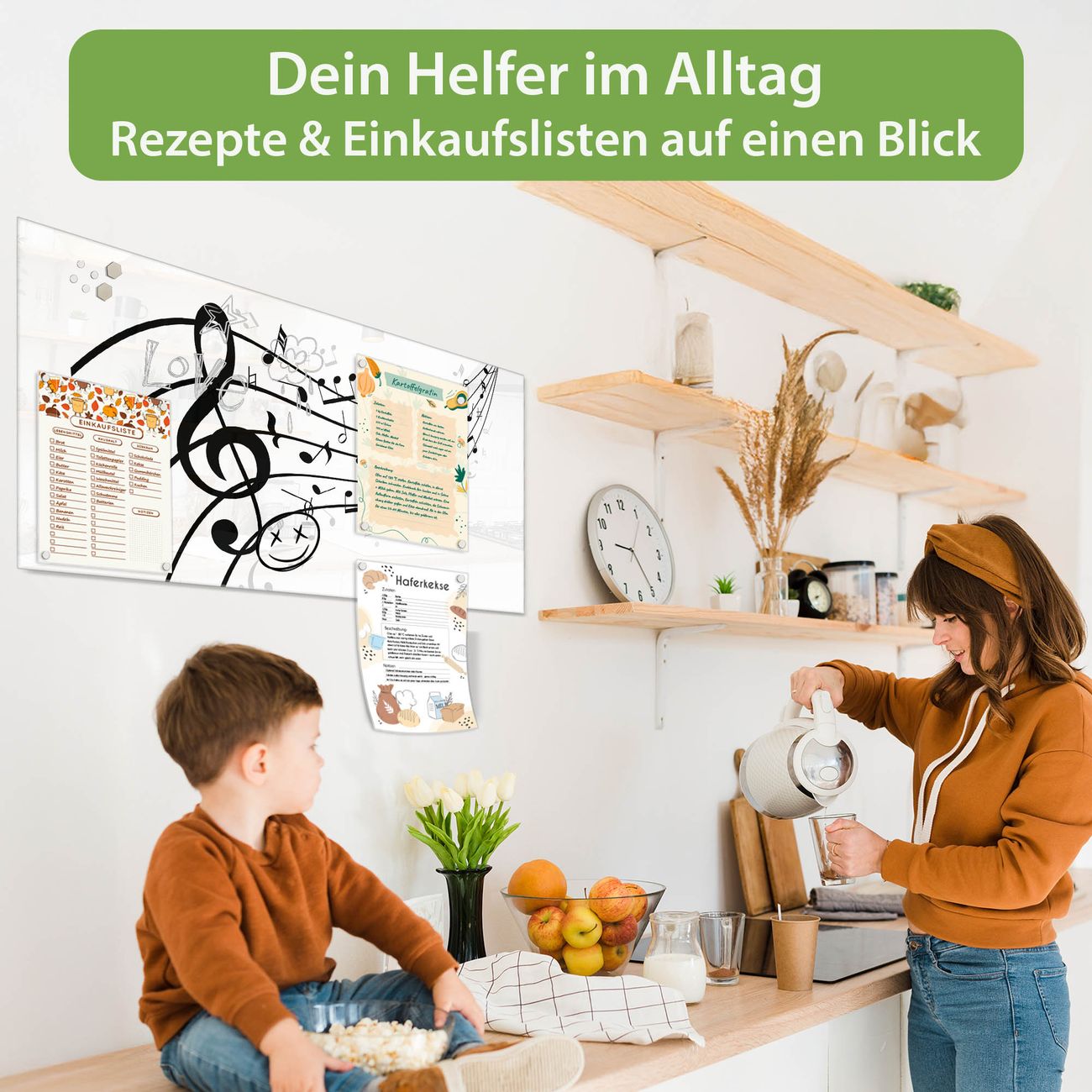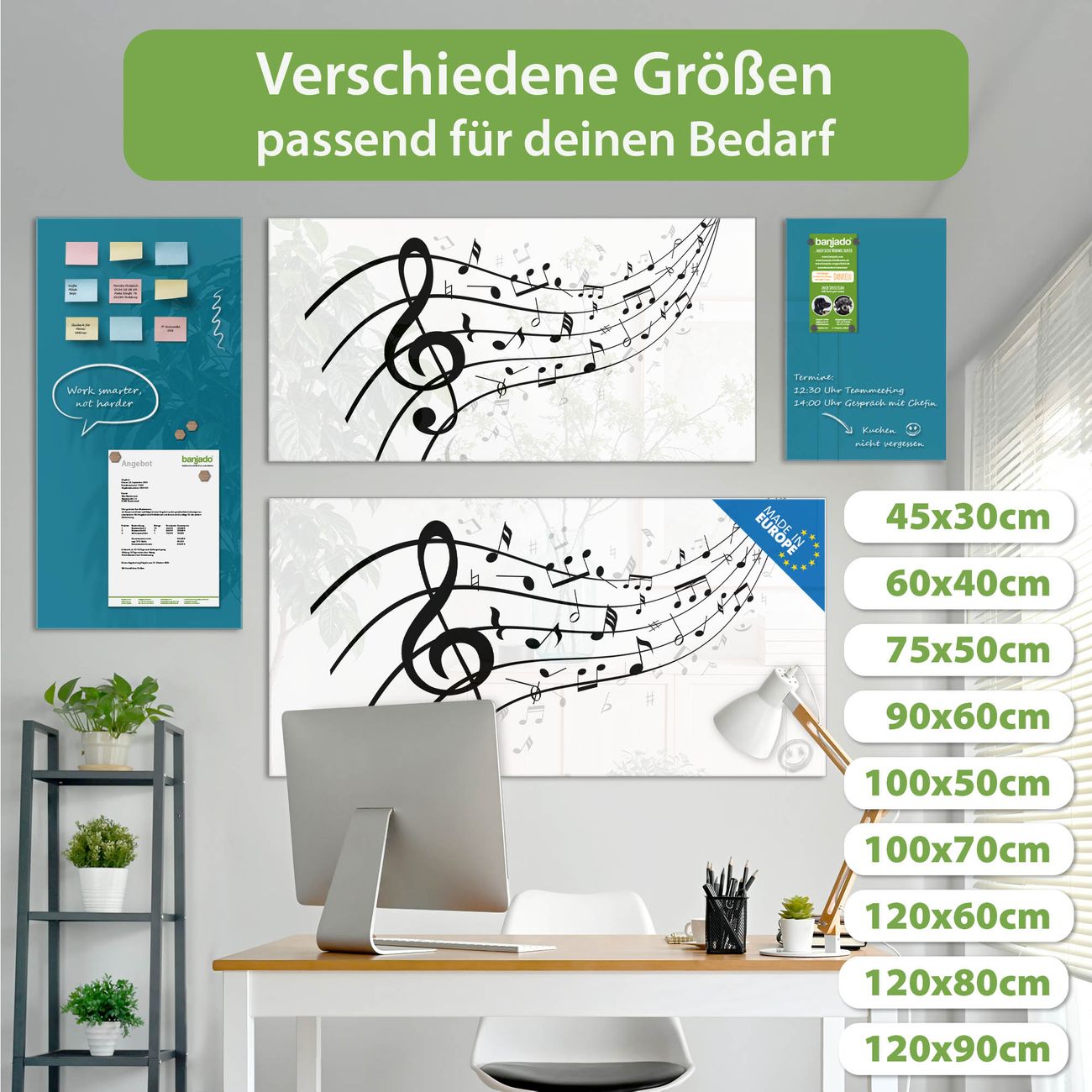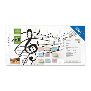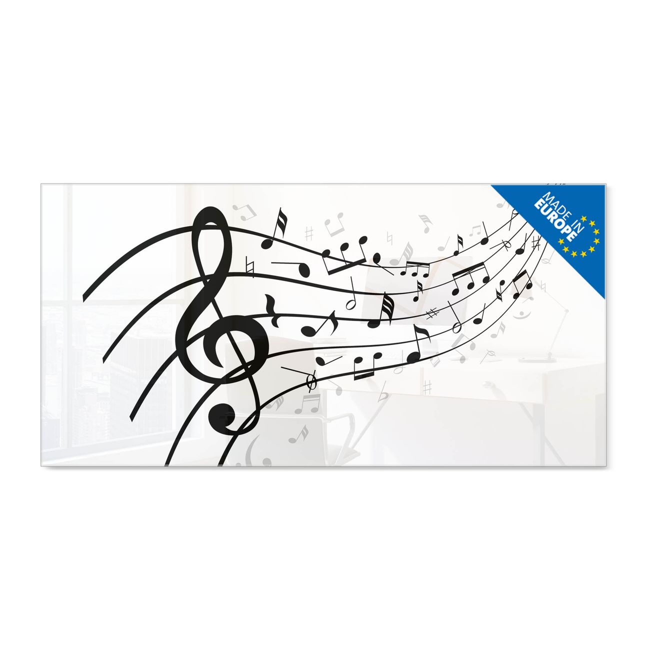 Material: 4mm Sicherheitsglas mit Metallrückwand Eigenschaften: beschreibbar, magnetisch, kratzfest Maße: 100x50x0,6cm, 7,50kg schwer Motiv Nummer 13321 Musikalische Noten Zubehör: inklusive 4 Neodym-Magnete
