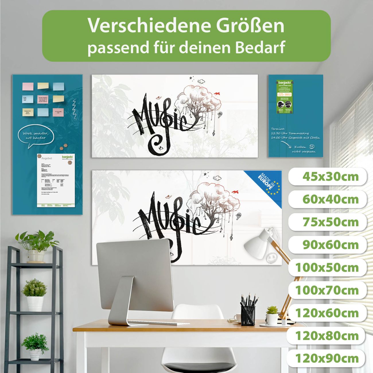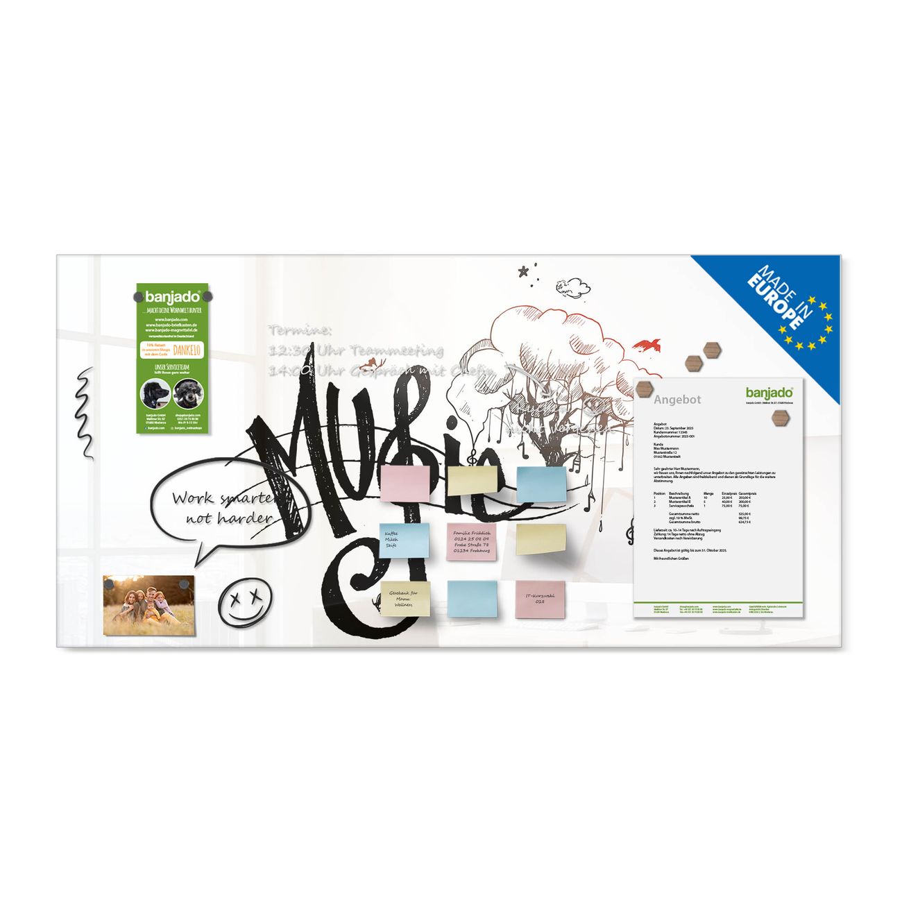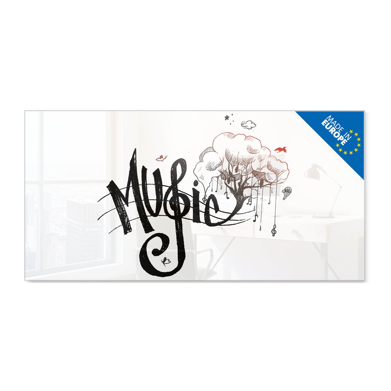 Material: 4mm Sicherheitsglas mit Metallrückwand Eigenschaften: beschreibbar, magnetisch, kratzfest Maße: 120x60x0,6cm, 10,80kg schwer Motiv Nummer 13318 Musikbaum Illustration Zubehör: inklusive 4 Neodym-Magnete
