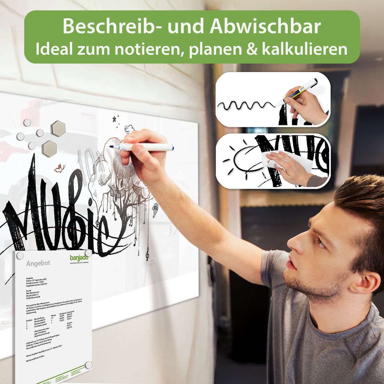Bitte beachten Sie, dass ausschliessliche spezielle Magnete an der Glastafel haften. Wir empfehlen banjado Neodym Magnete, diese sind durch uns auf Wirksamkeit geprüft.