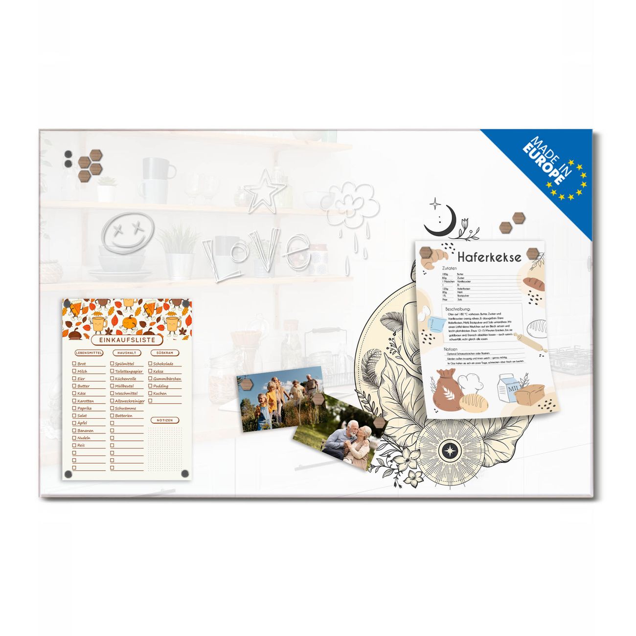 Auf der glatten Glasoberfläche lassen sich Termine, Rezepte oder Notizen ganz einfach mit Kreidestiften festhalten und rückstandslos entfernen. Starke Neodym-Magnete halten Ihre wichtigsten Erinnerungen sicher an Ort und Stelle. So entsteht Ihre ganz persönliche Ideenwand - jeden Tag neu.