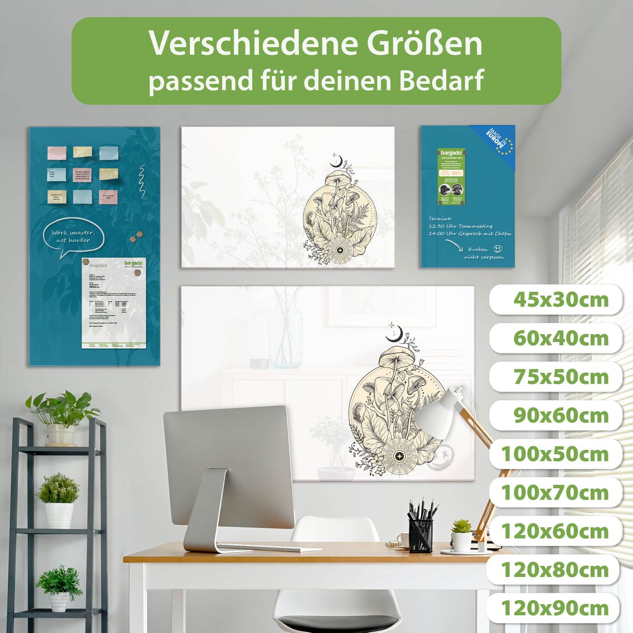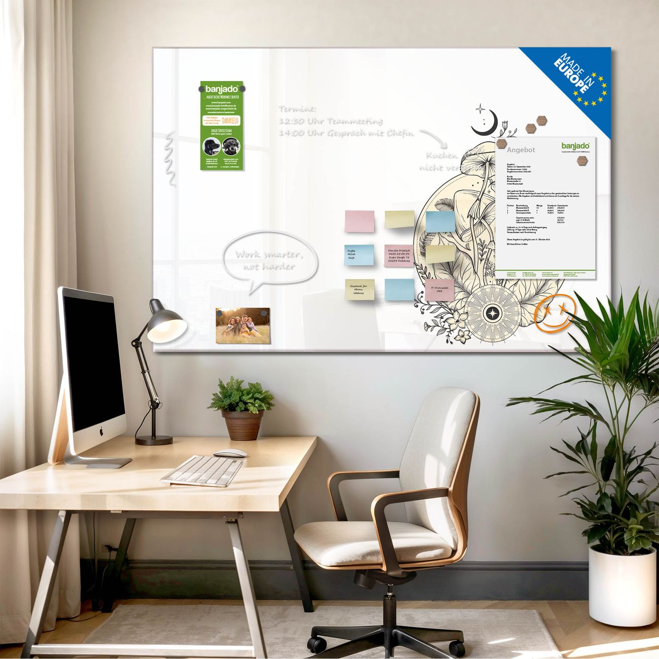 Jede Glas Magnettafel wird in unserer Werkstatt von Hand gefertigt und sorgfältig geprüft. So erhalten Sie ein echtes Qualitätsprodukt, das Funktion und Ästhetik perfekt vereint.?? Warum banjado?