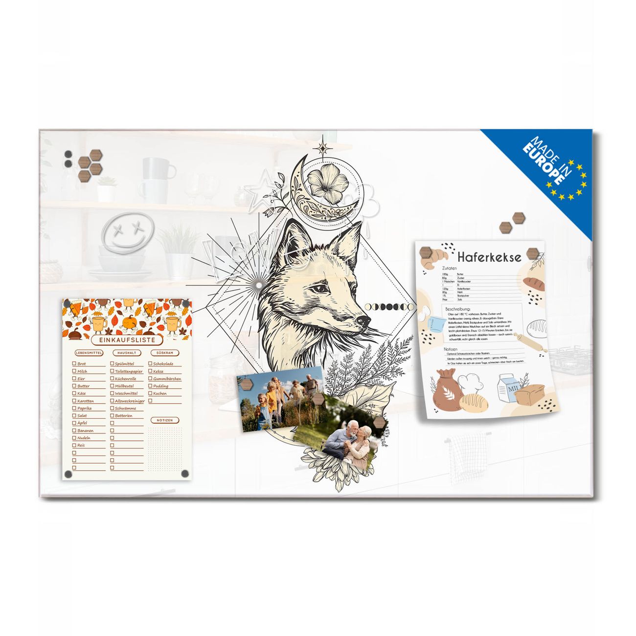 Ein Stück Design, das Ihren Alltag organisiert. Schreiben, heften, inspirieren - alles an einem Ort. Qualität, die man spürt. Montage leicht gemacht. Handwerk mit Herz - veredelt in Sachsen. Einzigartiges Design mit Motiv Motiv Mystischer Fuchs Beschreibbare Glasoberfläche, leicht zu reinigen Starke Magnetkraft durch Stahlrückwand Inklusive 4 Neodym-Magneten Flexible Montageoptionen Handveredelt in Sachsen - Qualität, die bleibt