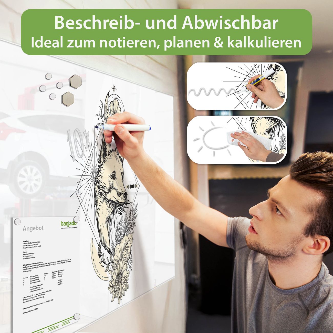 Jede Glas Magnettafel wird in unserer Werkstatt von Hand gefertigt und sorgfältig geprüft. So erhalten Sie ein echtes Qualitätsprodukt, das Funktion und Ästhetik perfekt vereint.?? Warum banjado?