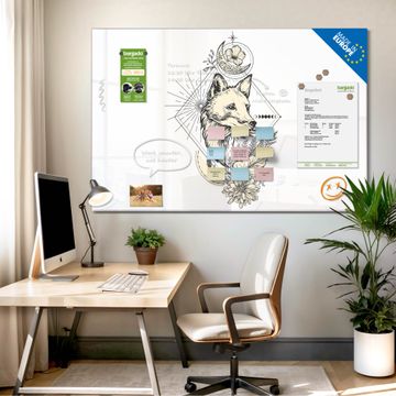 Material: 4mm Sicherheitsglas mit Metallrückwand Eigenschaften: beschreibbar, magnetisch, kratzfest Maße: 75x50x0,6cm, 5,63kg schwer Motiv Nummer 13474 Mystischer Fuchs Zubehör: inklusive 4 Neodym-Magnete
