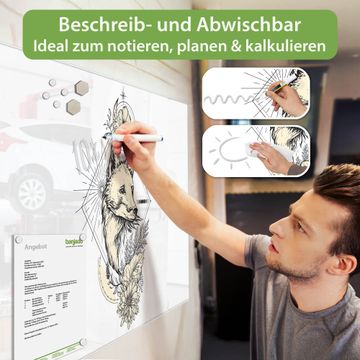 Auf der glatten Glasoberfläche lassen sich Termine, Rezepte oder Notizen ganz einfach mit Kreidestiften festhalten und rückstandslos entfernen. Starke Neodym-Magnete halten Ihre wichtigsten Erinnerungen sicher an Ort und Stelle. So entsteht Ihre ganz persönliche Ideenwand - jeden Tag neu.