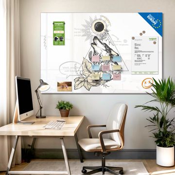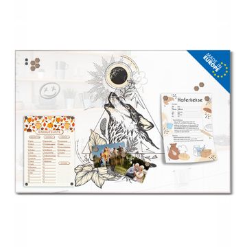 Material: 4mm Sicherheitsglas mit Metallrückwand Eigenschaften: beschreibbar, magnetisch, kratzfest Maße: 75x50x0,6cm, 5,63kg schwer Motiv Nummer 13475 Mystischer Wolf Zubehör: inklusive 4 Neodym-Magnete