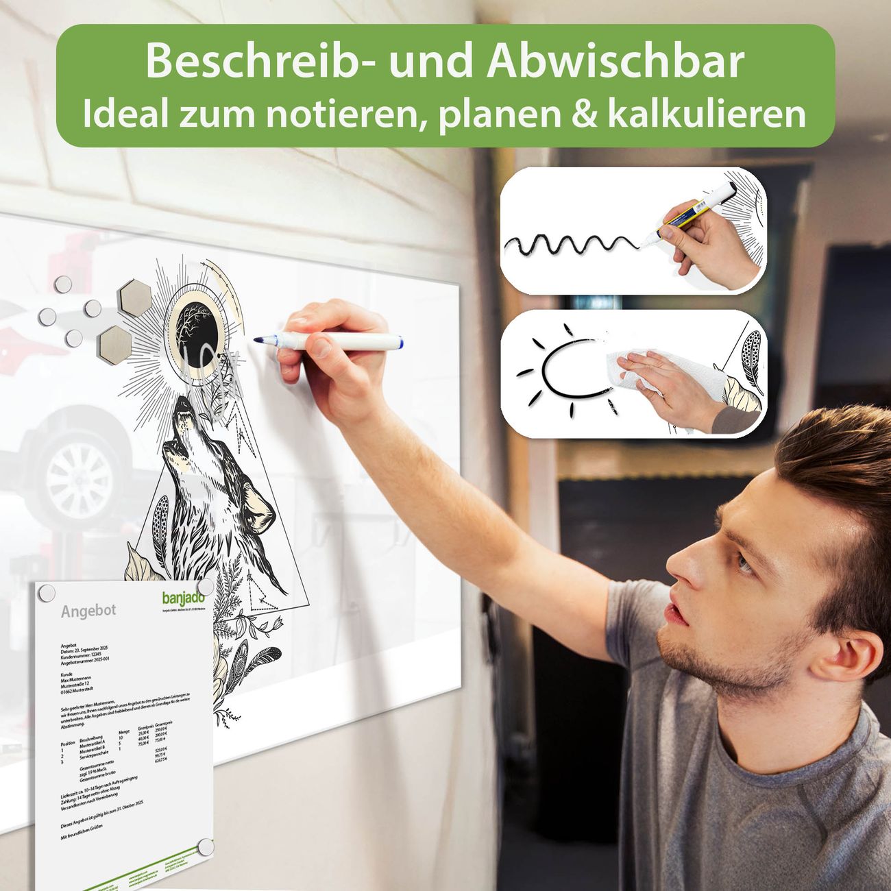 Material: 4mm Sicherheitsglas mit Metallrückwand Eigenschaften: beschreibbar, magnetisch, kratzfest Maße: 100x50x0,6cm, 7,50kg schwer Motiv Nummer 13475 Mystischer Wolf Zubehör: inklusive 4 Neodym-Magnete