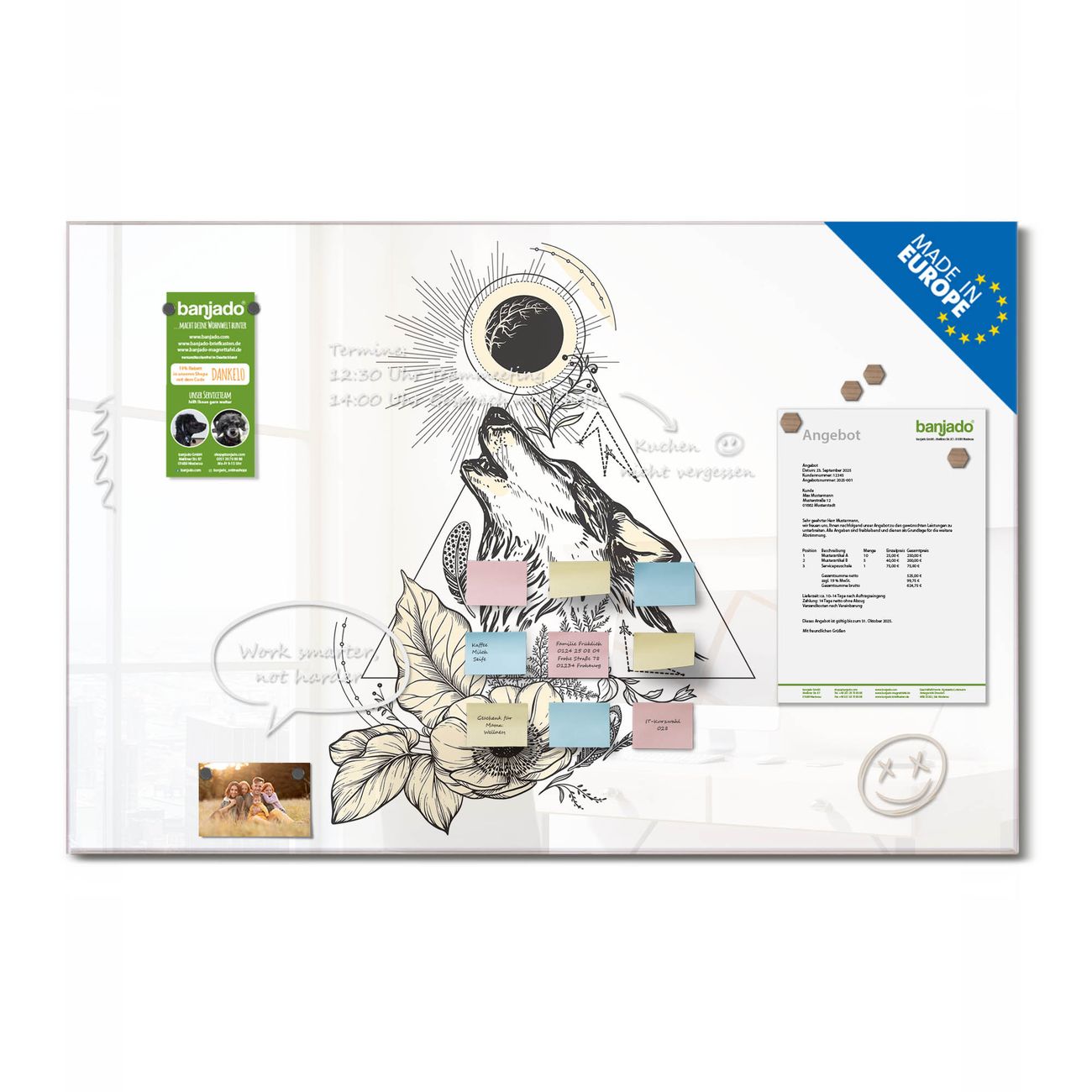 Material: 4mm Sicherheitsglas mit Metallrückwand Eigenschaften: beschreibbar, magnetisch, kratzfest Maße: 120x80x0,6cm, 14,40kg schwer Motiv Nummer 13475 Mystischer Wolf Zubehör: inklusive 4 Neodym-Magnete