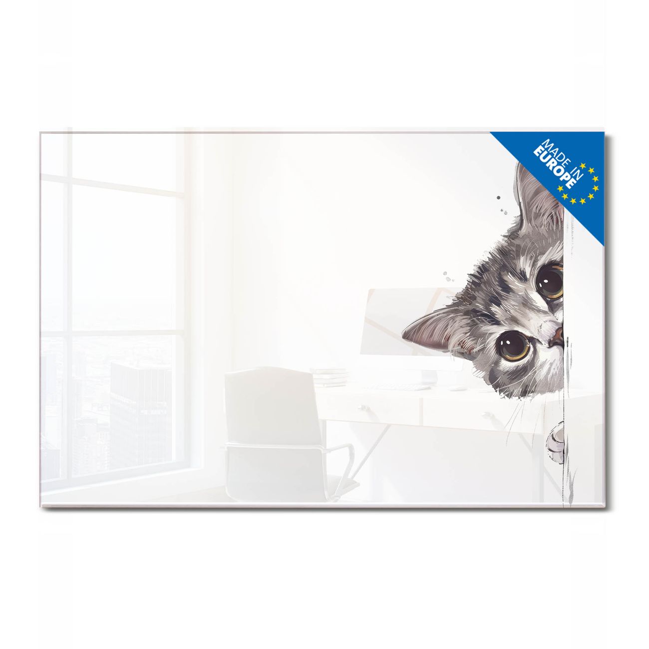 Material: 4mm Sicherheitsglas mit Metallrückwand Eigenschaften: beschreibbar, magnetisch, kratzfest Maße: 75x50x0,6cm, 5,63kg schwer Motiv Nummer 13444 Neugierige Katze Zubehör: inklusive 4 Neodym-Magnete