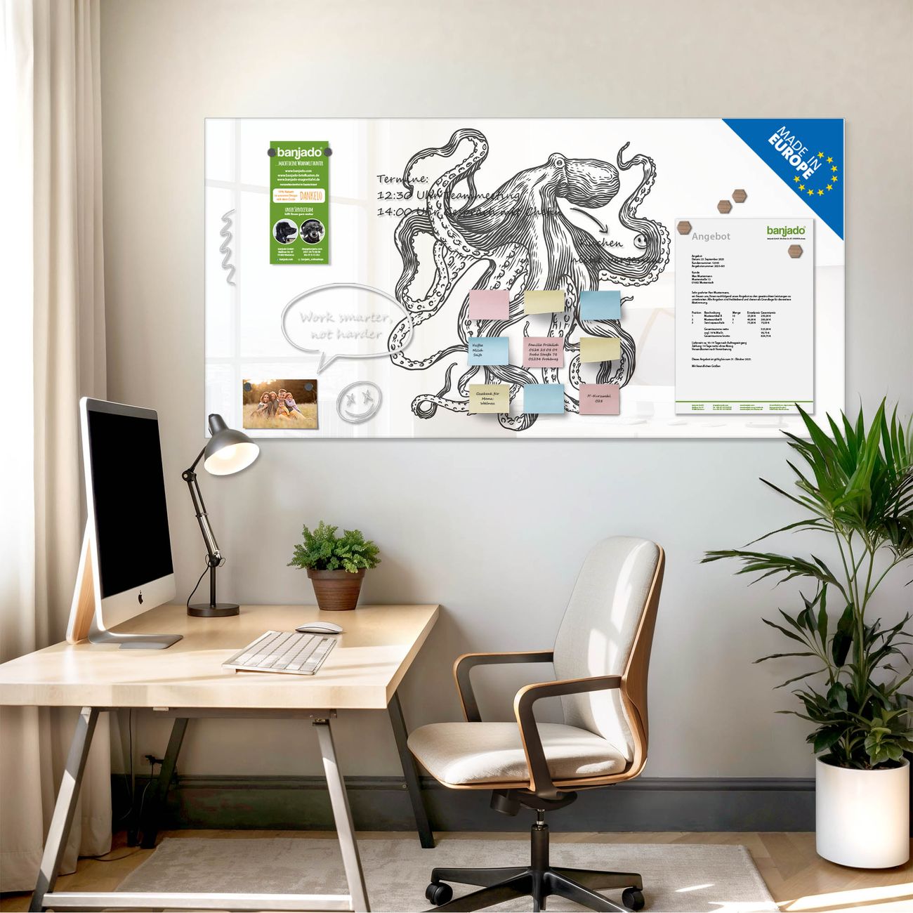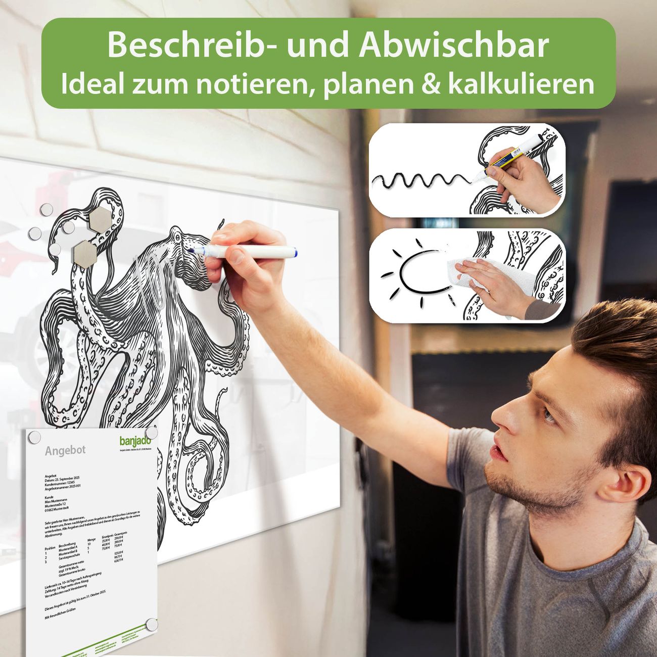 Material: 4mm Sicherheitsglas mit Metallrückwand Eigenschaften: beschreibbar, magnetisch, kratzfest Maße: 100x50x0,6cm, 7,50kg schwer Motiv Nummer 13085 Oktopus 10 Zubehör: inklusive 4 Neodym-Magnete