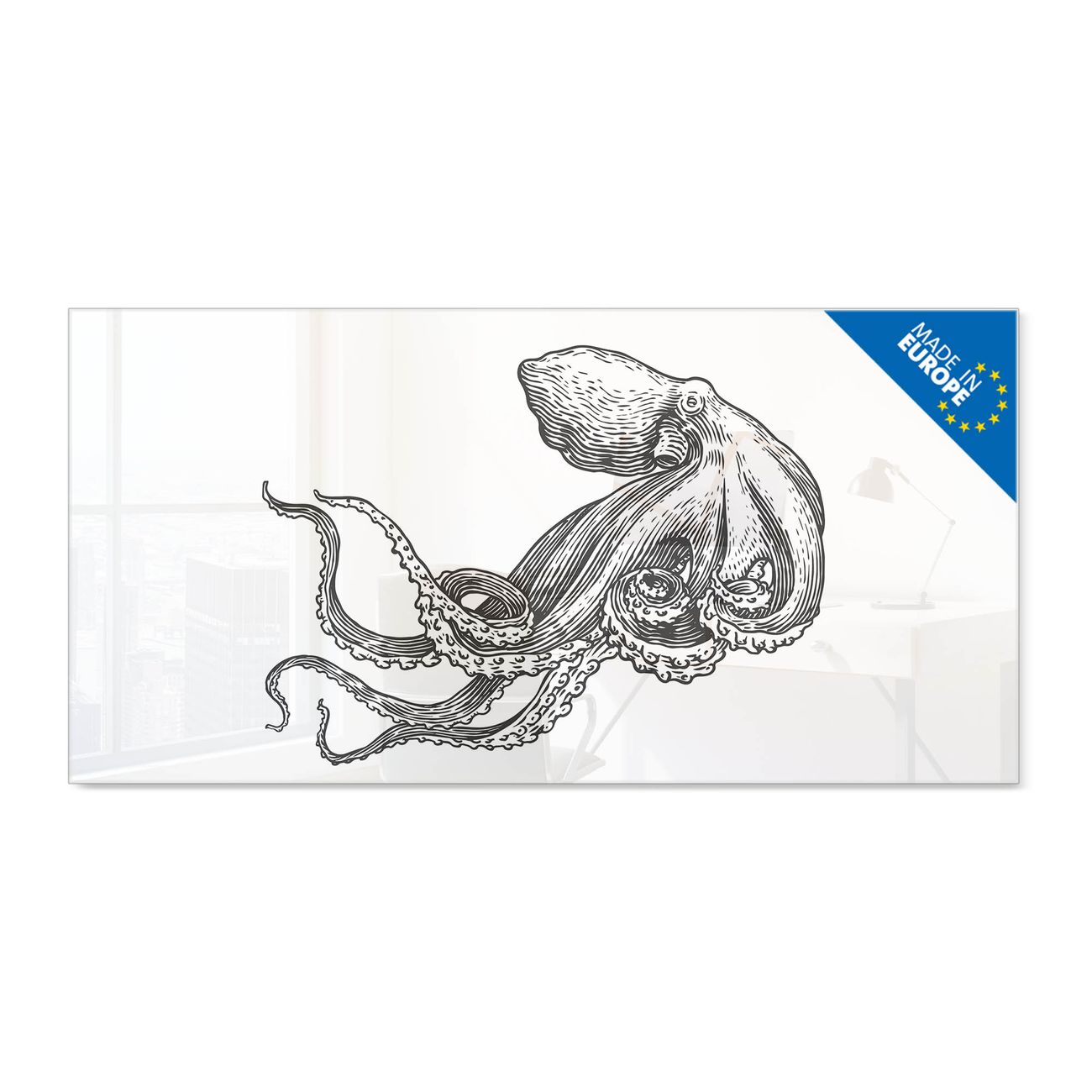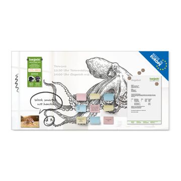 Material: 4mm Sicherheitsglas mit Metallrückwand Eigenschaften: beschreibbar, magnetisch, kratzfest Maße: 100x50x0,6cm, 7,50kg schwer Motiv Nummer 13081 Oktopus 6 Zubehör: inklusive 4 Neodym-Magnete