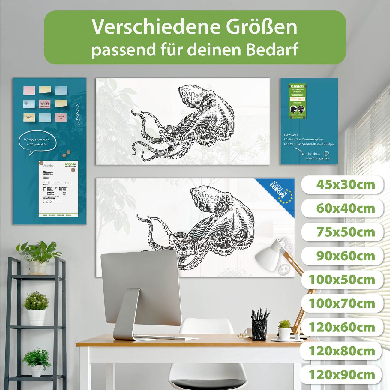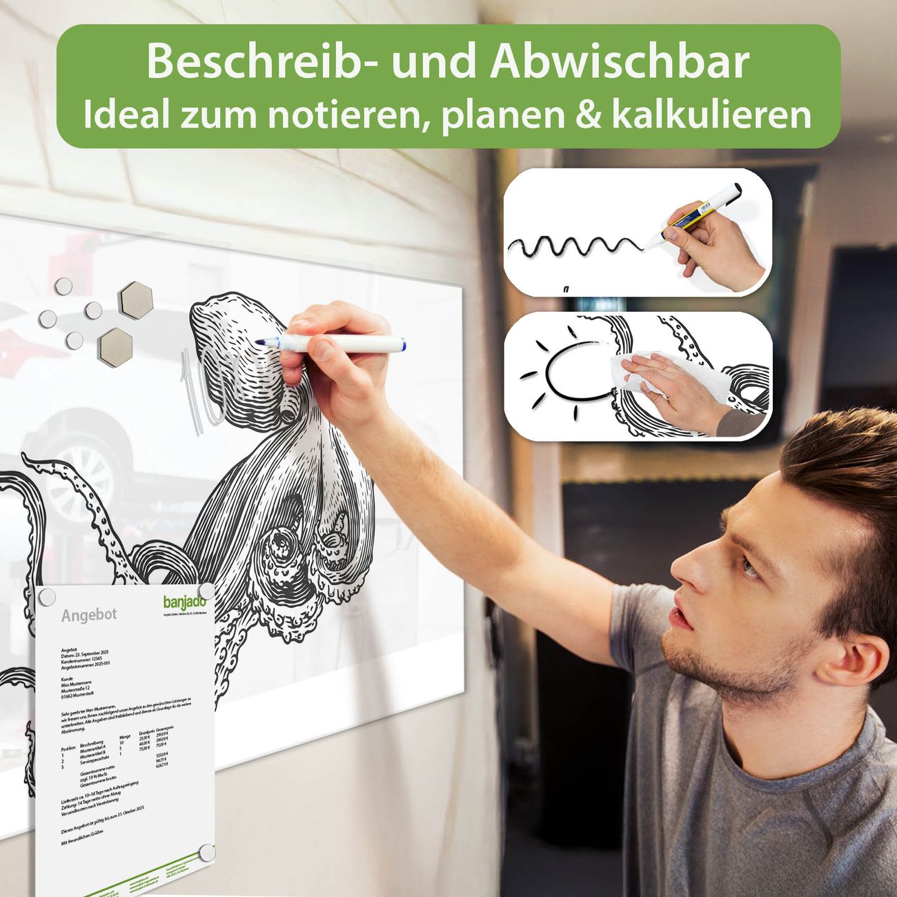 Jede Glas Magnettafel wird in unserer Werkstatt von Hand gefertigt und sorgfältig geprüft. So erhalten Sie ein echtes Qualitätsprodukt, das Funktion und Ästhetik perfekt vereint.?? Warum banjado?