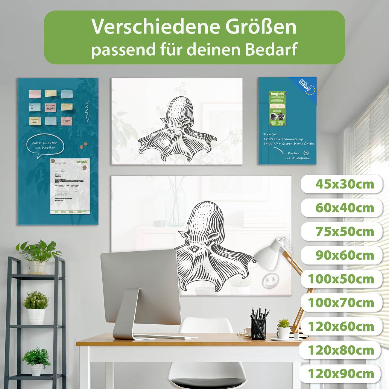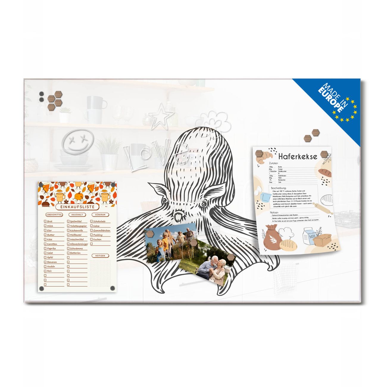 Material: 4mm Sicherheitsglas mit Metallrückwand Eigenschaften: beschreibbar, magnetisch, kratzfest Maße: 90x60x0,6cm, 8,10kg schwer Motiv Nummer 13082 Oktopus 7 Zubehör: inklusive 4 Neodym-Magnete