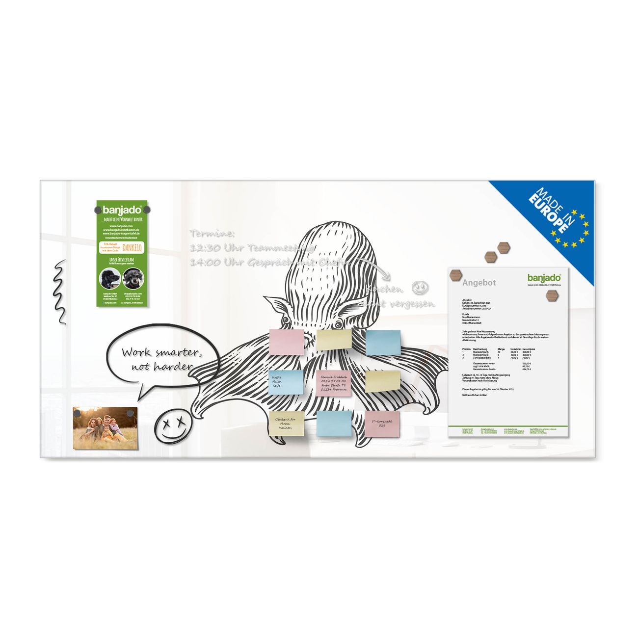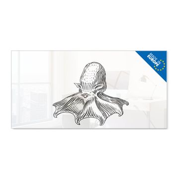 Material: 4mm Sicherheitsglas mit Metallrückwand Eigenschaften: beschreibbar, magnetisch, kratzfest Maße: 100x50x0,6cm, 7,50kg schwer Motiv Nummer 13082 Oktopus 7 Zubehör: inklusive 4 Neodym-Magnete