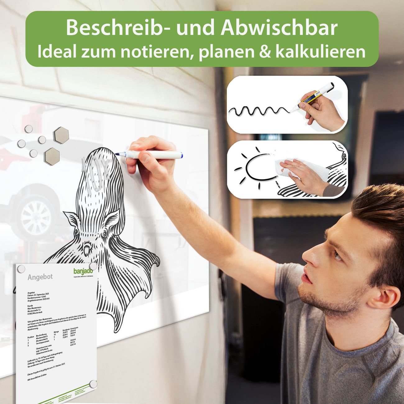 Jede Glas Magnettafel wird in unserer Werkstatt von Hand gefertigt und sorgfältig geprüft. So erhalten Sie ein echtes Qualitätsprodukt, das Funktion und Ästhetik perfekt vereint.?? Warum banjado?