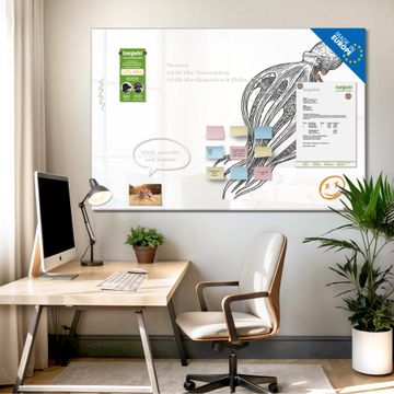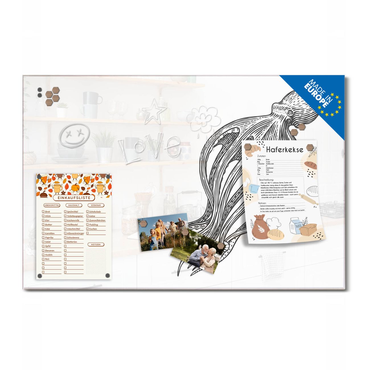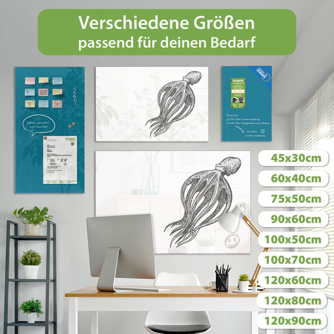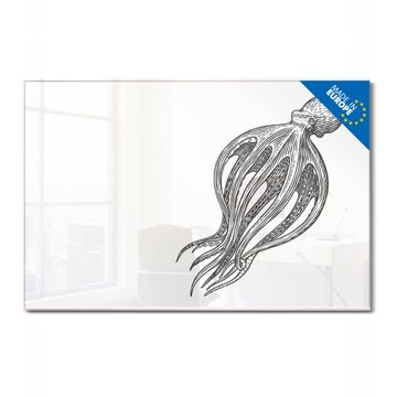 Material: 4mm Sicherheitsglas mit Metallrückwand Eigenschaften: beschreibbar, magnetisch, kratzfest Maße: 90x60x0,6cm, 8,10kg schwer Motiv Nummer 13083 Oktopus 8 Zubehör: inklusive 4 Neodym-Magnete