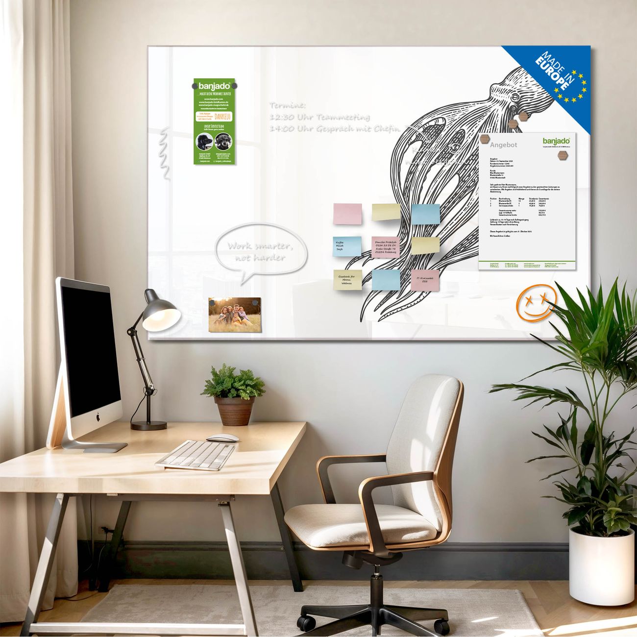 Jede Glas Magnettafel wird in unserer Werkstatt von Hand gefertigt und sorgfältig geprüft. So erhalten Sie ein echtes Qualitätsprodukt, das Funktion und Ästhetik perfekt vereint.?? Warum banjado?
