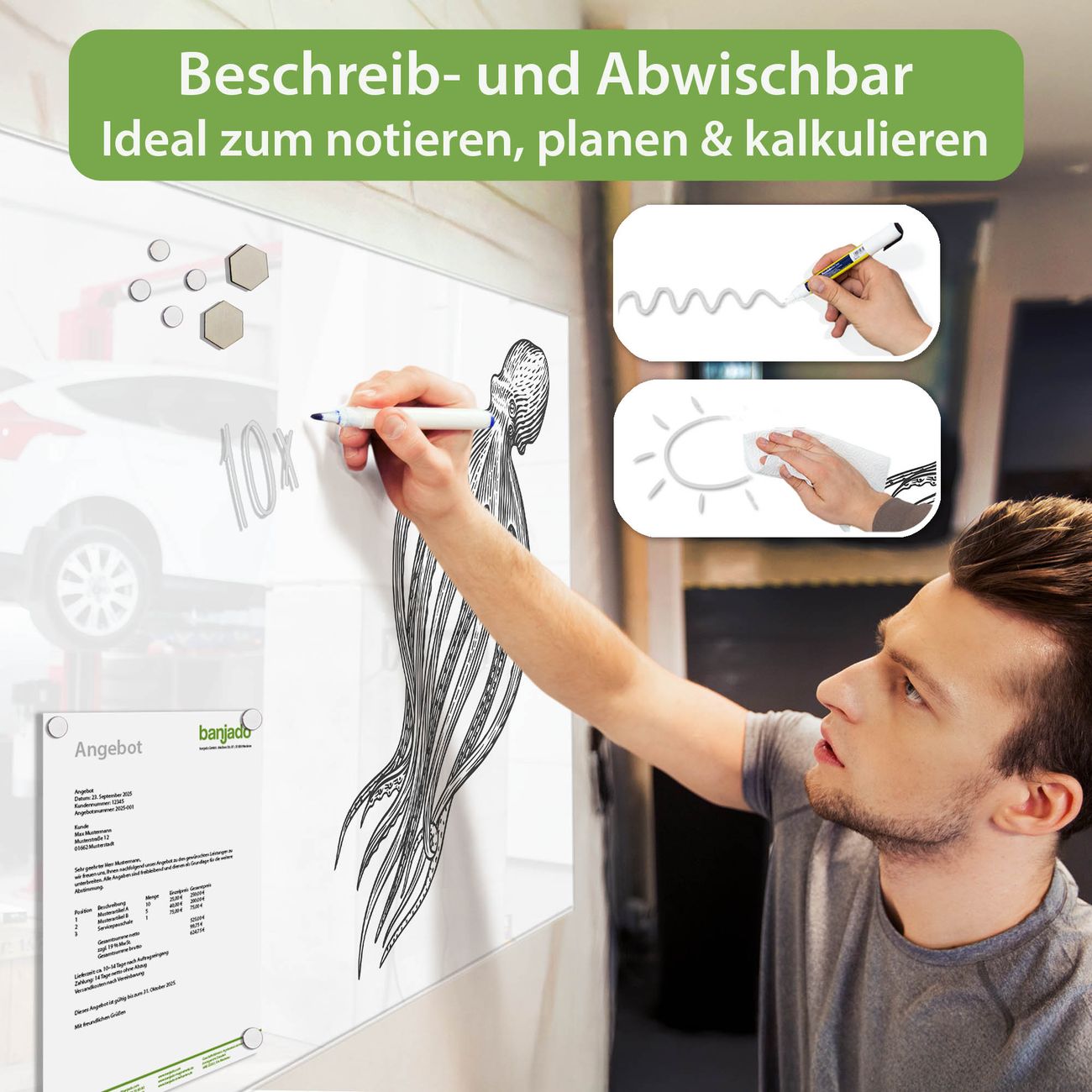 Auf der glatten Glasoberfläche lassen sich Termine, Rezepte oder Notizen ganz einfach mit Kreidestiften festhalten und rückstandslos entfernen. Starke Neodym-Magnete halten Ihre wichtigsten Erinnerungen sicher an Ort und Stelle. So entsteht Ihre ganz persönliche Ideenwand - jeden Tag neu.