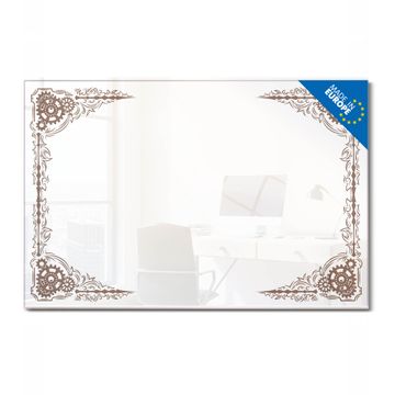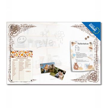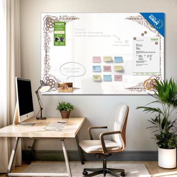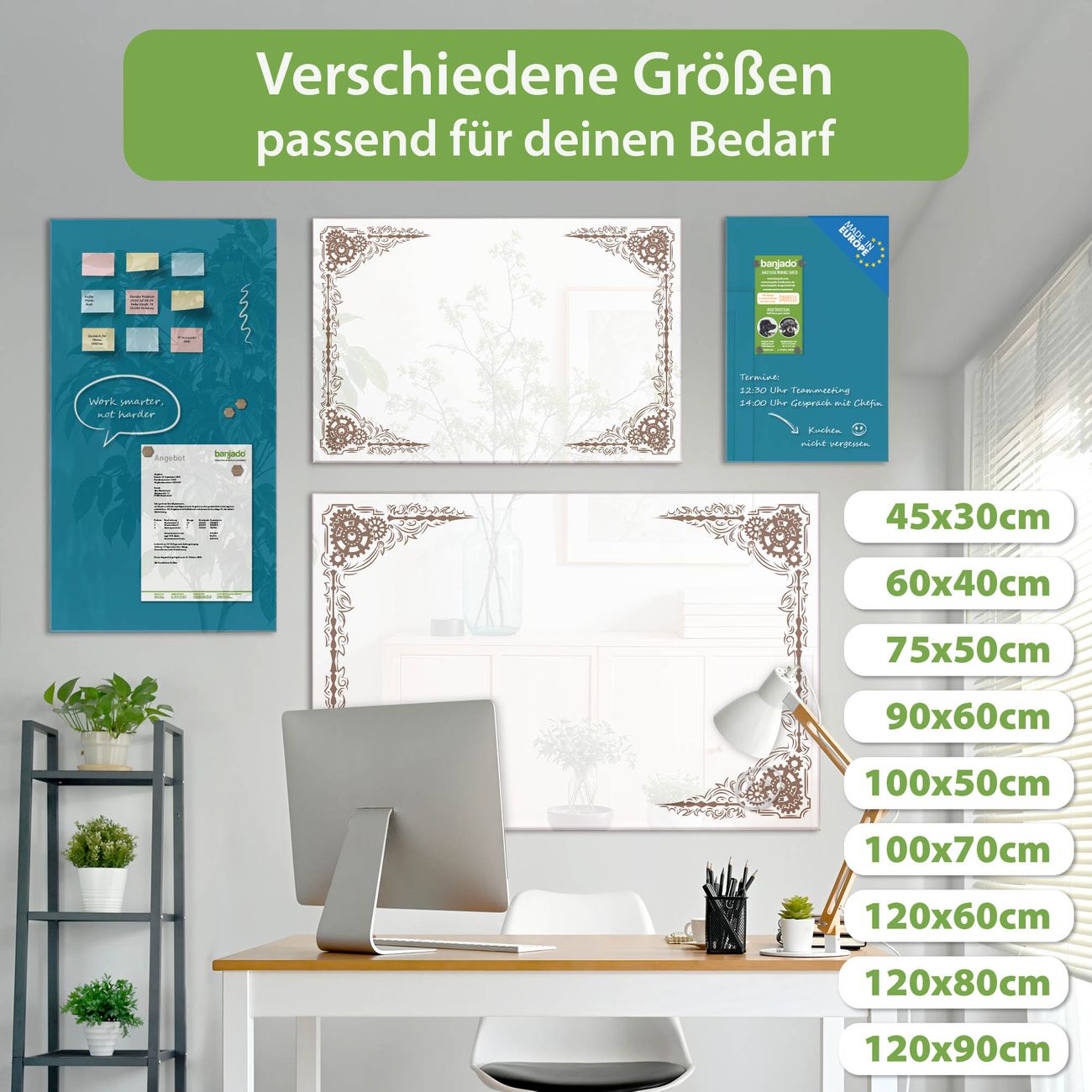 Material: 4mm Sicherheitsglas mit Metallrückwand Eigenschaften: beschreibbar, magnetisch, kratzfest Maße: 75x50x0,6cm, 5,63kg schwer Motiv Nummer 13581 Ornamentaler Zahnräderrahmen Zubehör: inklusive 4 Neodym-Magnete