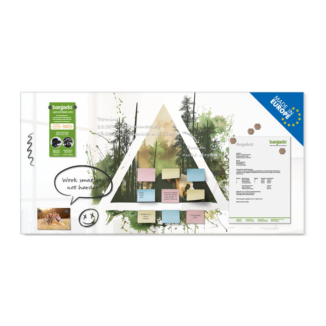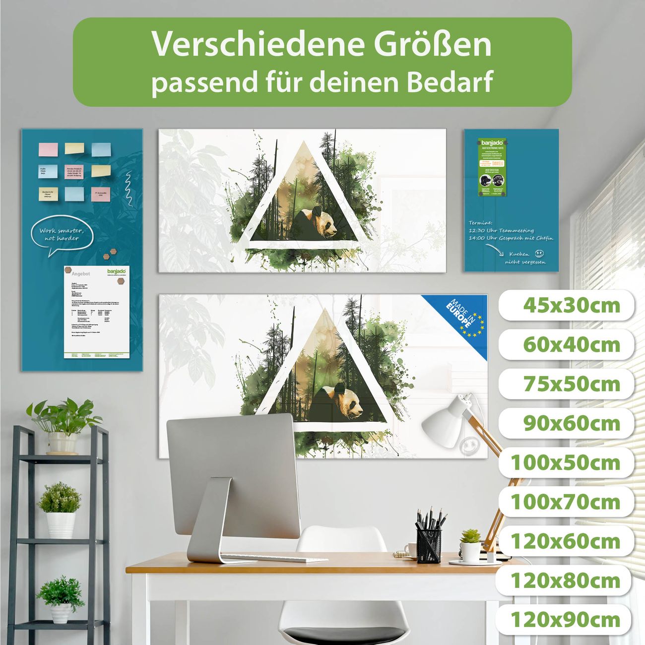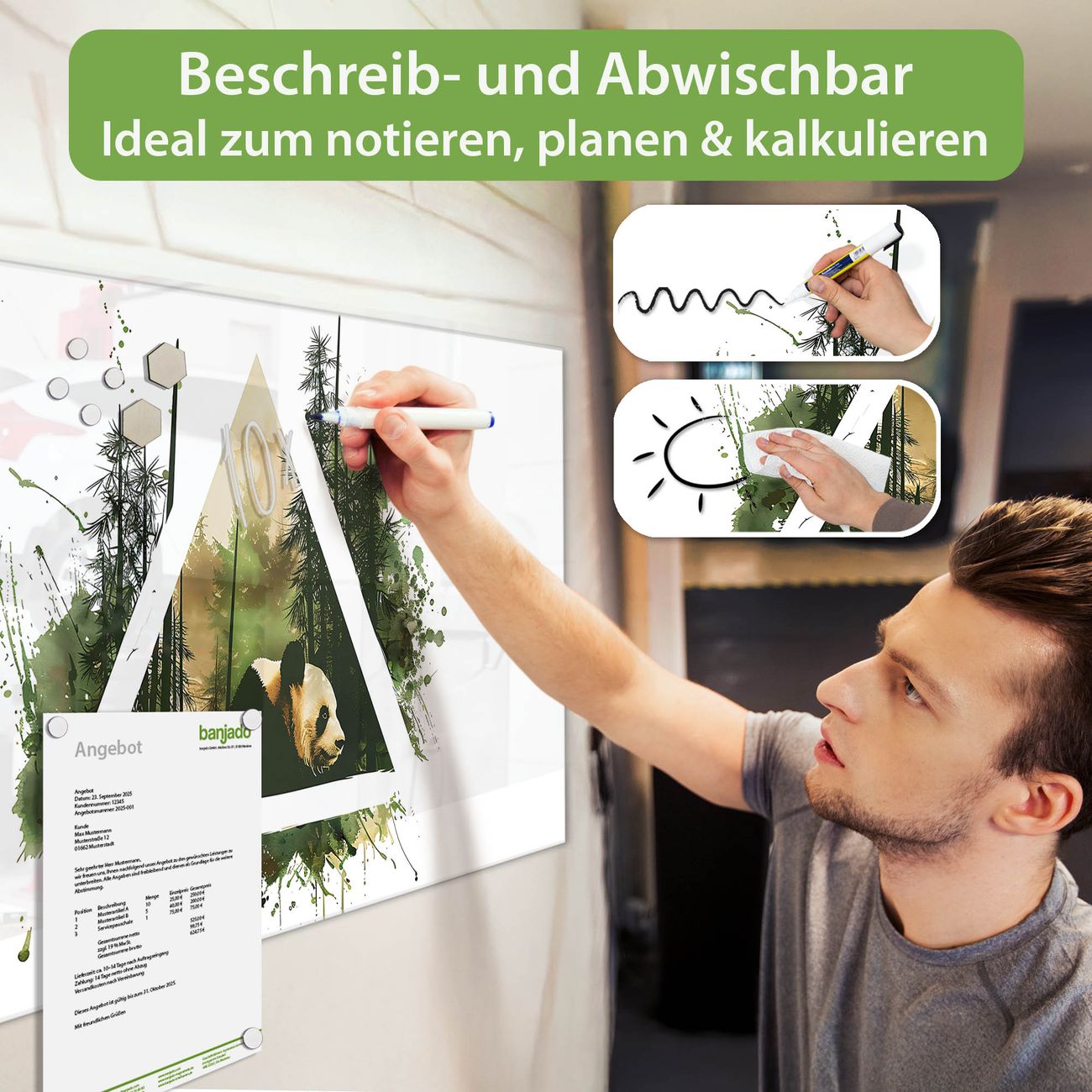 Material: 4mm Sicherheitsglas mit Metallrückwand Eigenschaften: beschreibbar, magnetisch, kratzfest Maße: 100x50x0,6cm, 7,50kg schwer Motiv Nummer 13466 Panda im Wald Dreieck Zubehör: inklusive 4 Neodym-Magnete