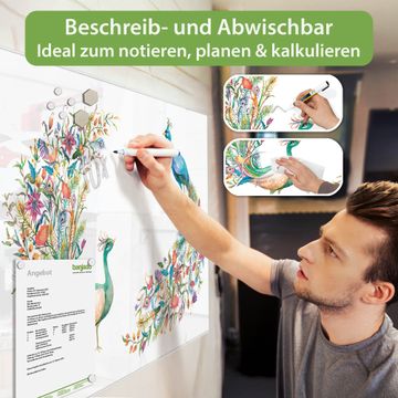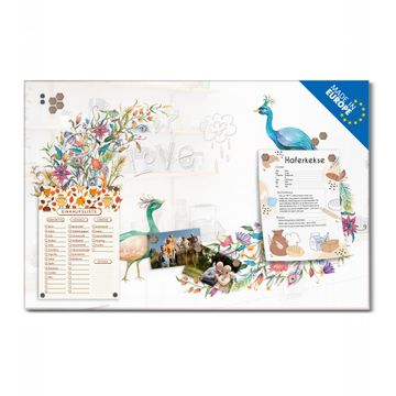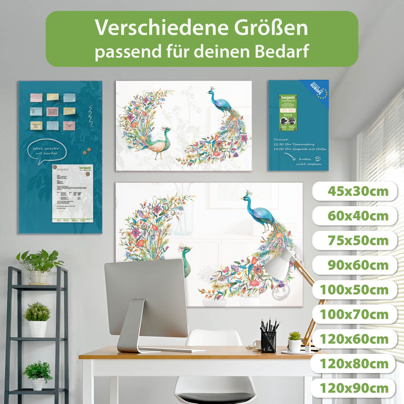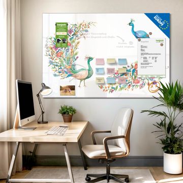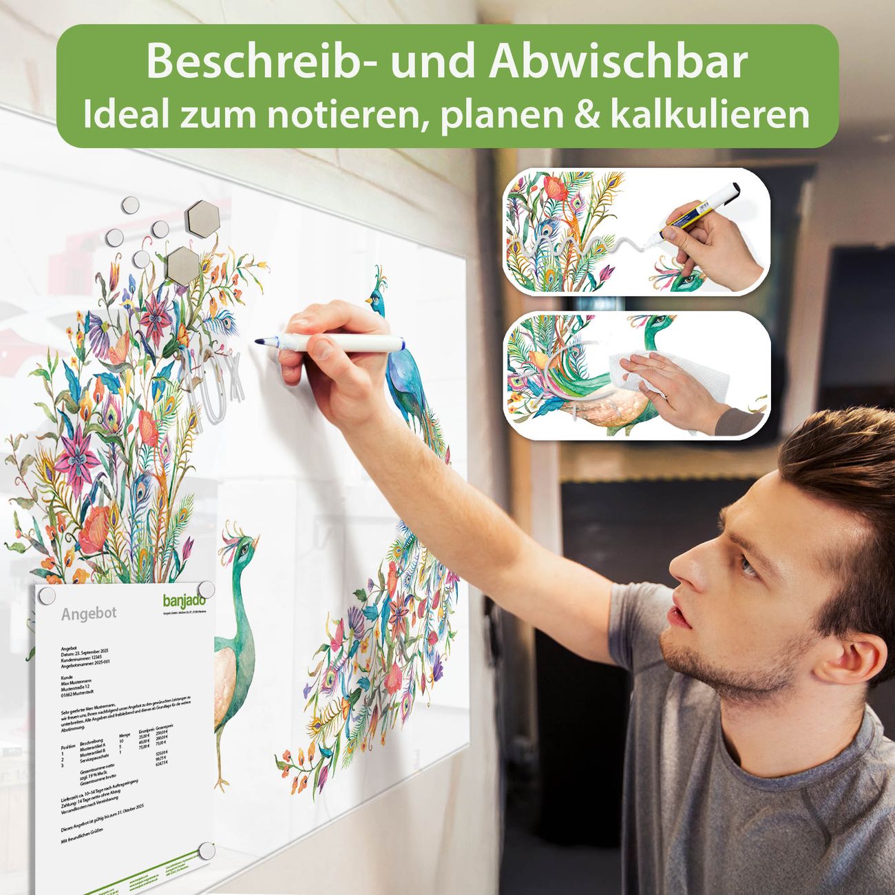 Material: 4mm Sicherheitsglas mit Metallrückwand Eigenschaften: beschreibbar, magnetisch, kratzfest Maße: 75x50x0,6cm, 5,63kg schwer Motiv Nummer 13586 Pfauenparadies Zubehör: inklusive 4 Neodym-Magnete