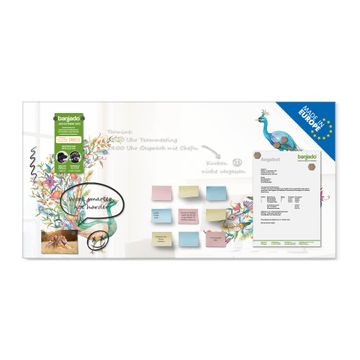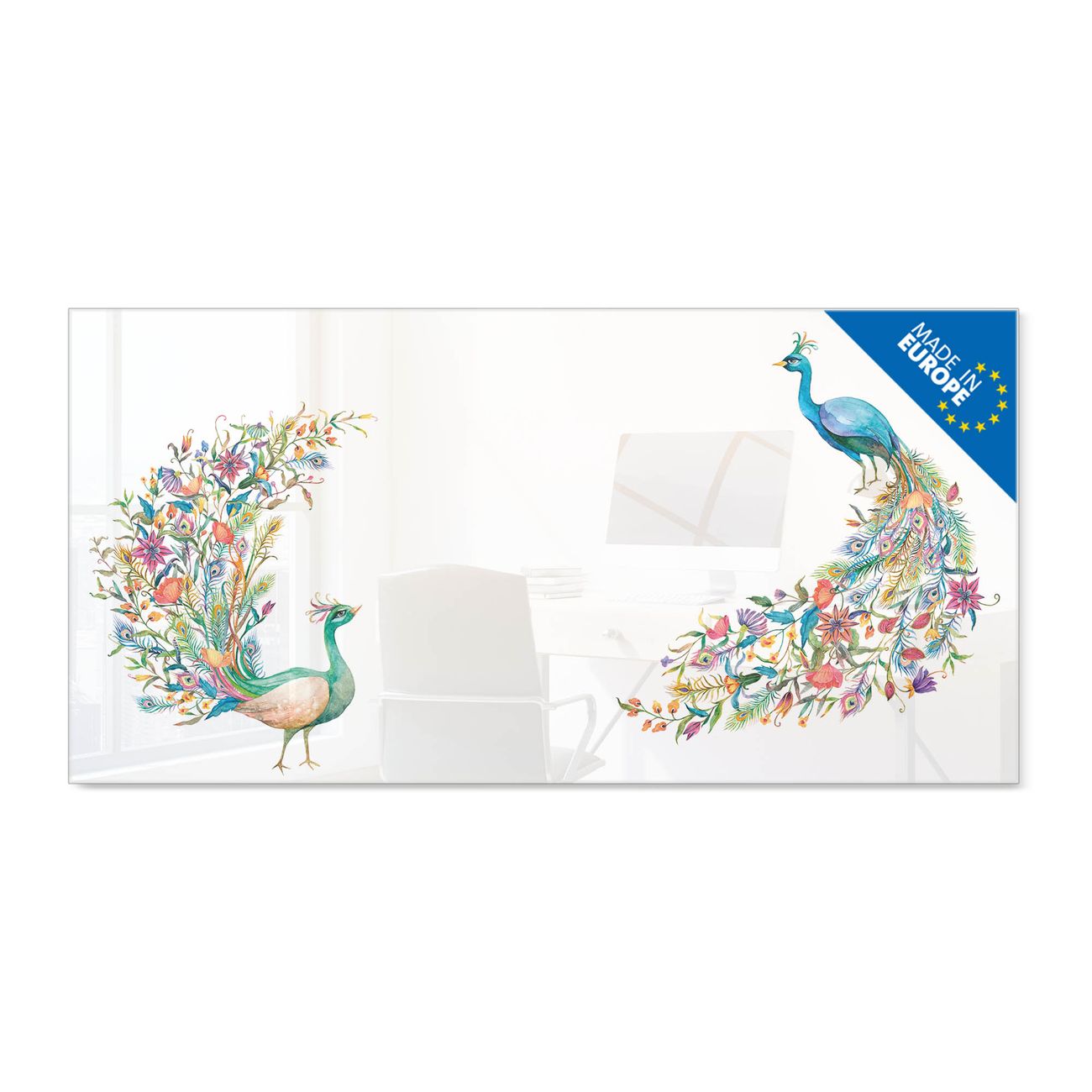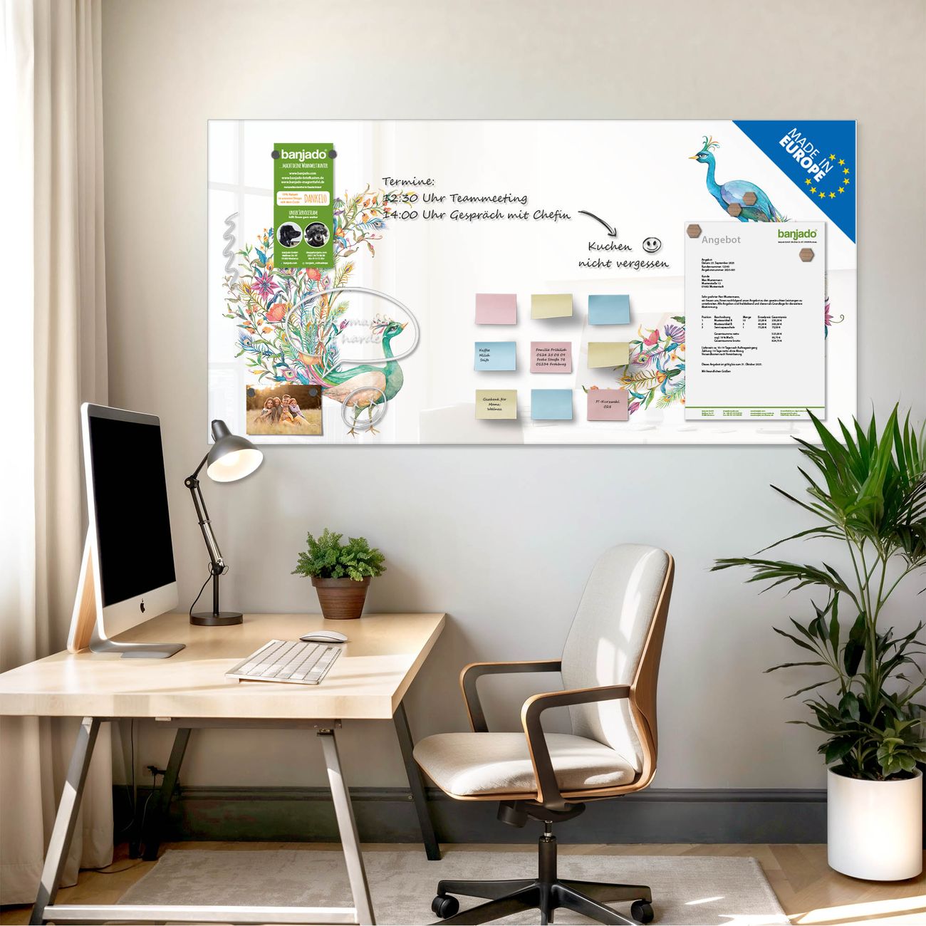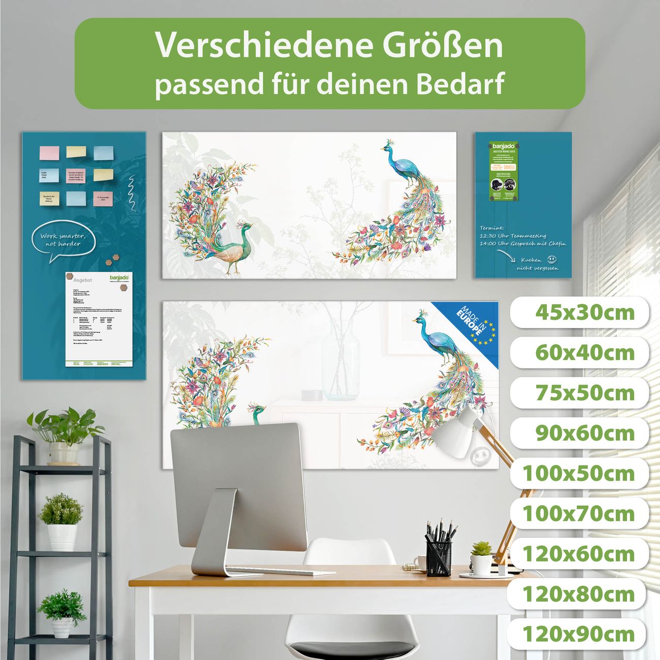 Material: 4mm Sicherheitsglas mit Metallrückwand Eigenschaften: beschreibbar, magnetisch, kratzfest Maße: 100x50x0,6cm, 7,50kg schwer Motiv Nummer 13586 Pfauenparadies Zubehör: inklusive 4 Neodym-Magnete