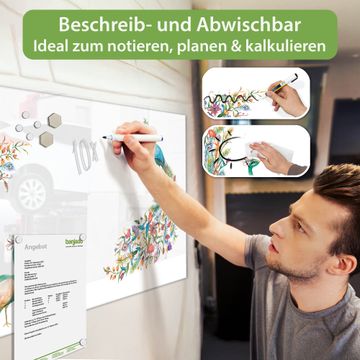 Auf der glatten Glasoberfläche lassen sich Termine, Rezepte oder Notizen ganz einfach mit Kreidestiften festhalten und rückstandslos entfernen. Starke Neodym-Magnete halten Ihre wichtigsten Erinnerungen sicher an Ort und Stelle. So entsteht Ihre ganz persönliche Ideenwand - jeden Tag neu.