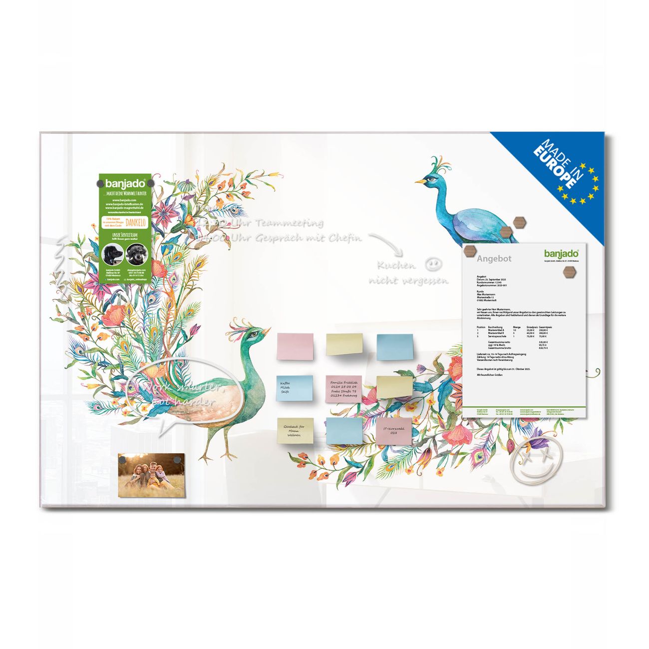 Ein Stück Design, das Ihren Alltag organisiert. Schreiben, heften, inspirieren - alles an einem Ort. Qualität, die man spürt. Montage leicht gemacht. Handwerk mit Herz - veredelt in Sachsen. Einzigartiges Design mit Motiv Motiv Pfauenparadies Beschreibbare Glasoberfläche, leicht zu reinigen Starke Magnetkraft durch Stahlrückwand Inklusive 4 Neodym-Magneten Flexible Montageoptionen Handveredelt in Sachsen - Qualität, die bleibt