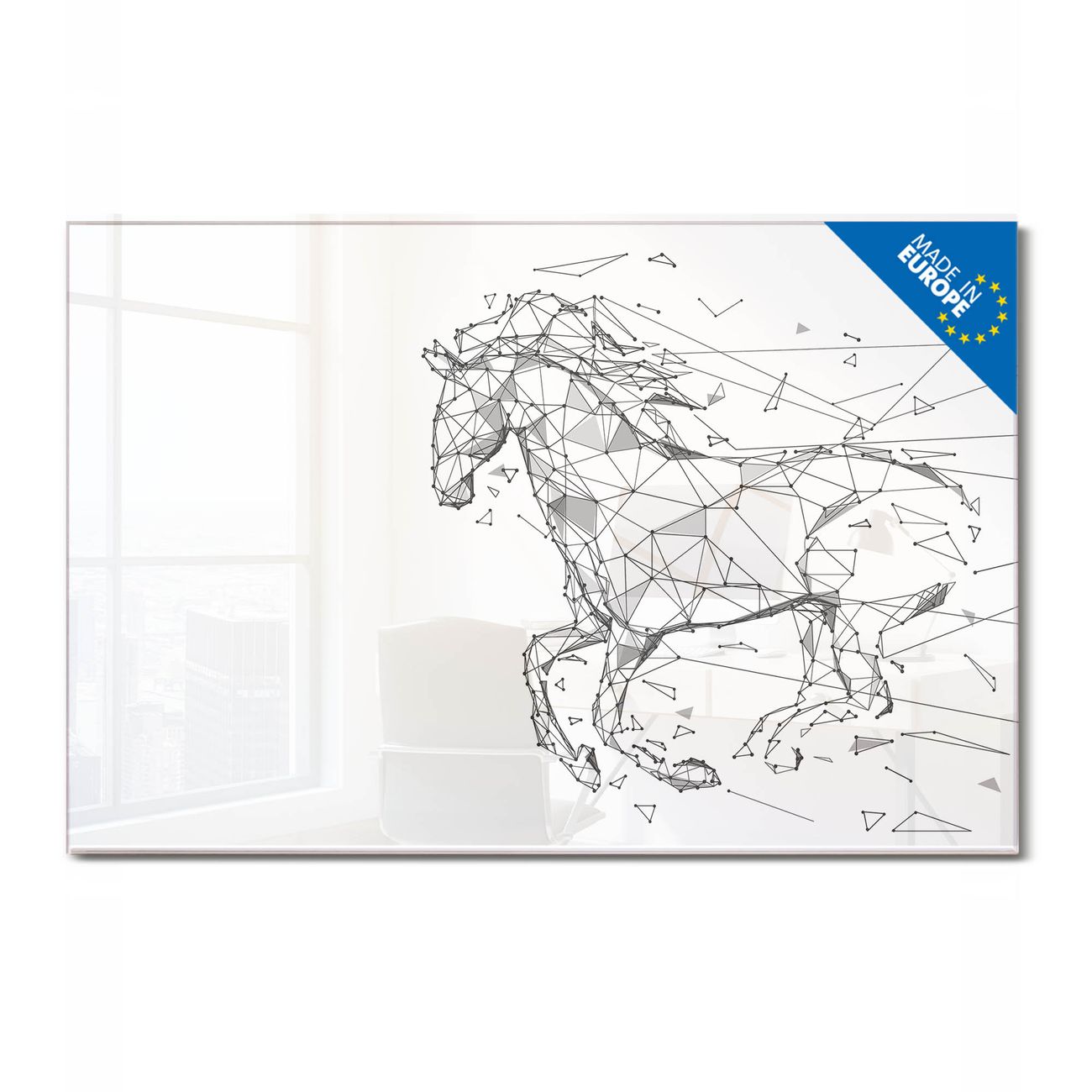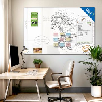 Material: 4mm Sicherheitsglas mit Metallrückwand Eigenschaften: beschreibbar, magnetisch, kratzfest Maße: 90x60x0,6cm, 8,10kg schwer Motiv Nummer 13024 Pferd abstrakt 2 Zubehör: inklusive 4 Neodym-Magnete