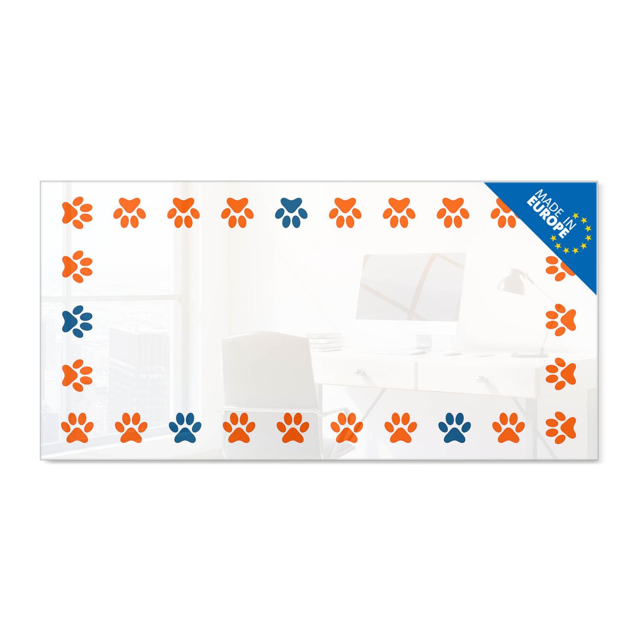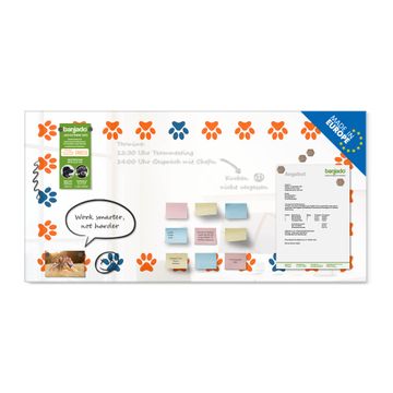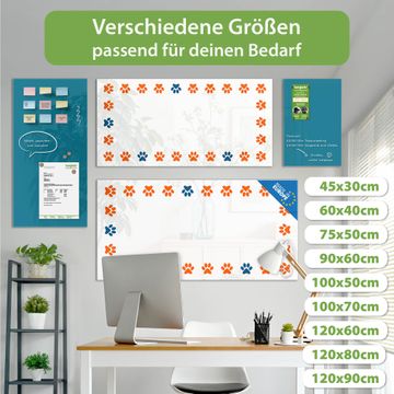 Material: 4mm Sicherheitsglas mit Metallrückwand Eigenschaften: beschreibbar, magnetisch, kratzfest Maße: 100x50x0,6cm, 7,50kg schwer Motiv Nummer 13490 Pfotenrahmen Zubehör: inklusive 4 Neodym-Magnete
