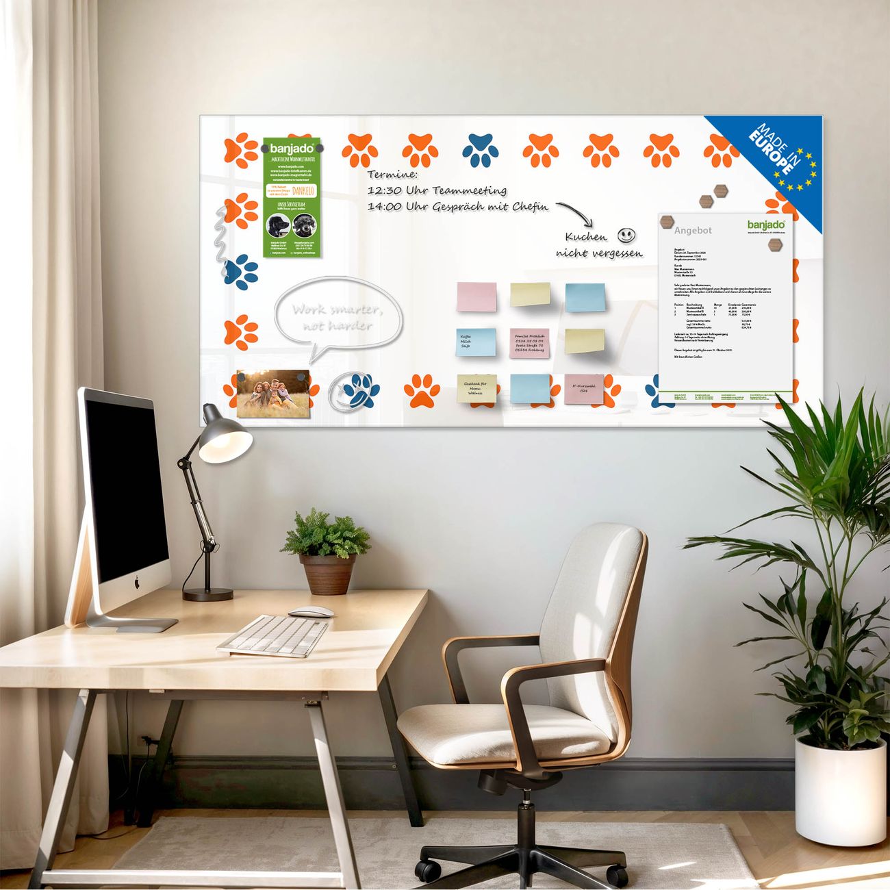 Die banjado Glas Magnettafel mit dem Motiv Motiv Pfotenrahmen verbindet Funktionalität mit Stil. Sie ersetzt das Zettelchaos durch klare Strukturen und bringt dabei eine warme, natürliche Atmosphäre in Ihr Zuhause. Ob im Büro, in der Küche oder im Eingangsbereich - dieses Design-Board zieht Blicke an und sorgt für Ordnung mit Charakter.