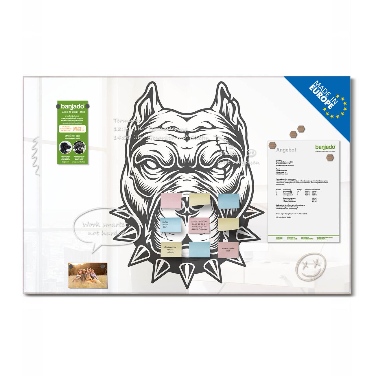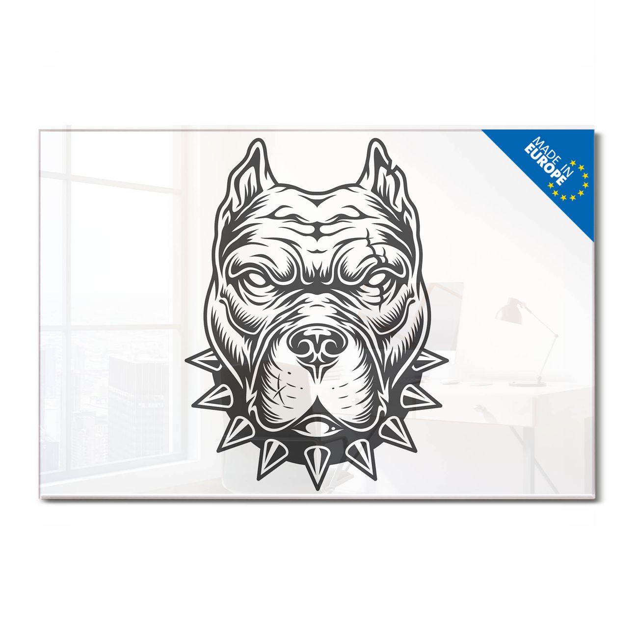 Material: 4mm Sicherheitsglas mit Metallrückwand Eigenschaften: beschreibbar, magnetisch, kratzfest Maße: 120x80x0,6cm, 14,40kg schwer Motiv Nummer 13424 Pitbull Portrait Zubehör: inklusive 4 Neodym-Magnete